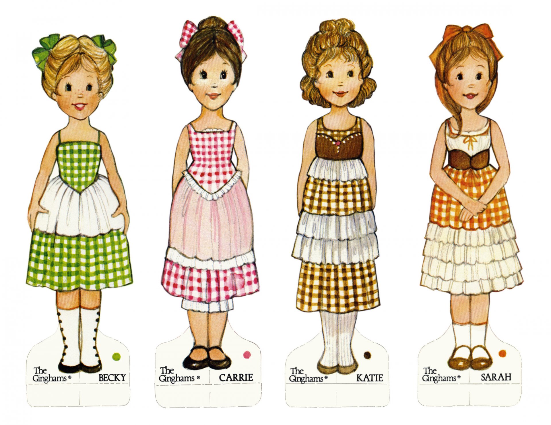 Ces poupées étaient pliables, la tête des poupées était retirée afin de faciliter le changement de vêtements des filles. Les poupées ont été produites en plusieurs tailles - grandes 20-35 cm de hauteur et petites versions «cartes postales» qui pouvaient être découpées et, si désiré, utilisées comme cartes postales.