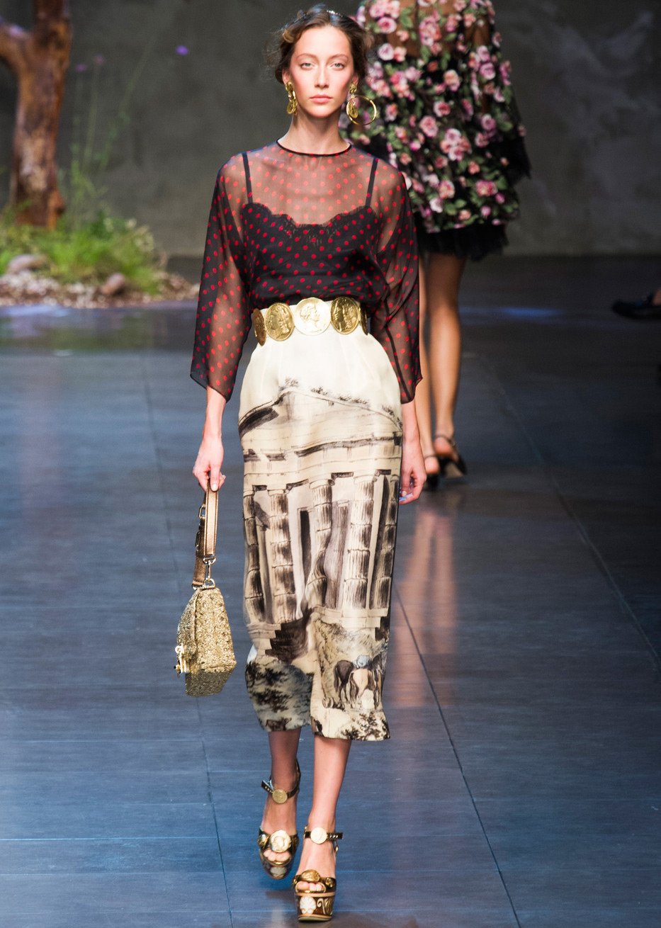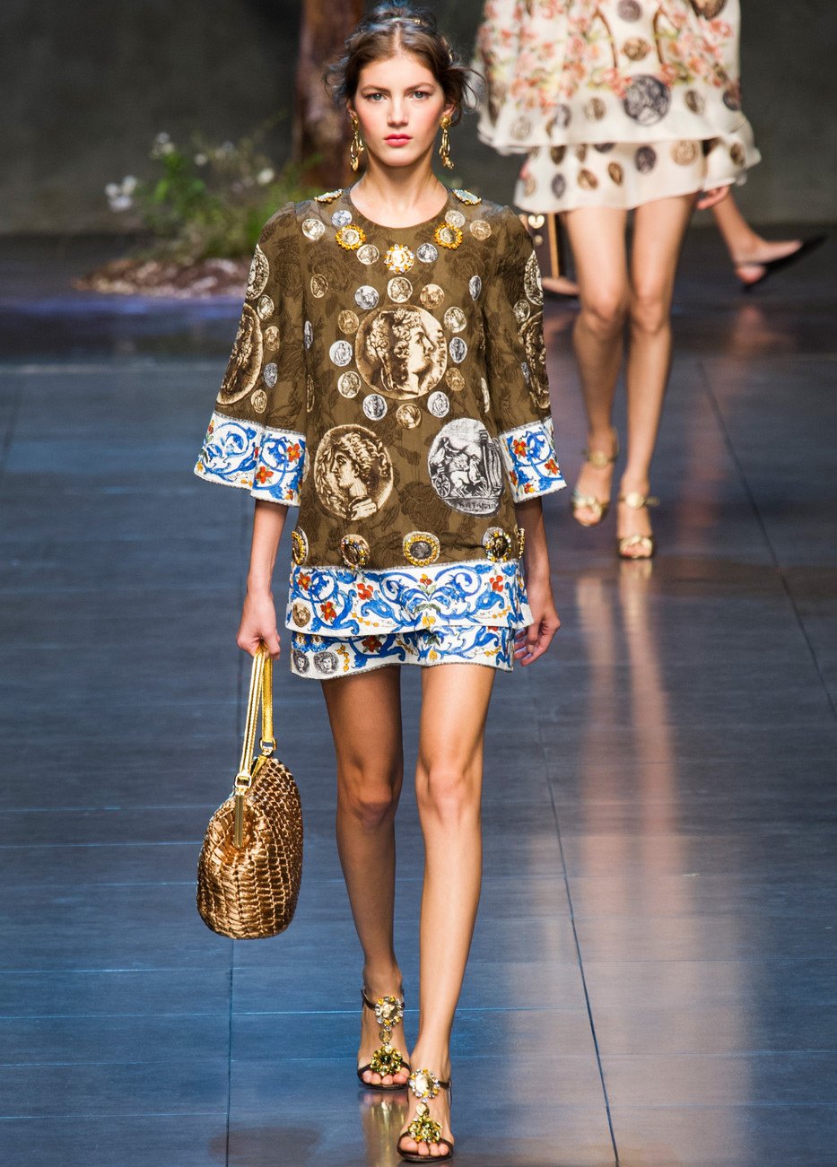 Des profils de grands et scandaleux empereurs ornent les filles modernes. Il y a beaucoup de pièces de monnaie dans la collection, elles sont présentes sous forme d'imprimés sur tissu, ainsi que sur des ceintures, des bijoux et des sacs.