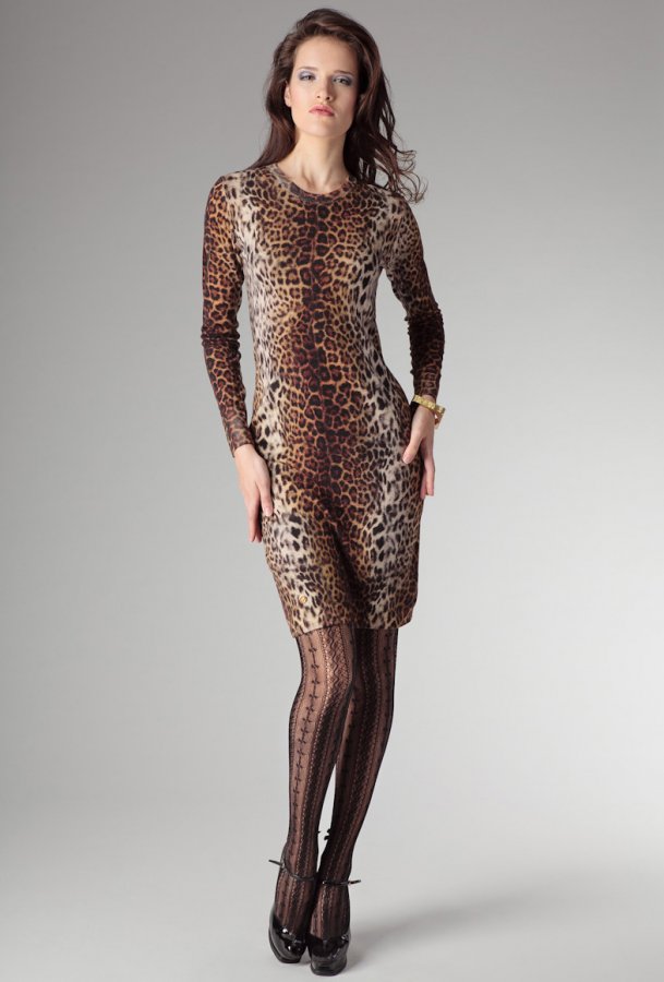 Pour garder le style, choisissez un tissu cher avec un imprimé pedigree, vous éviterez alors la vulgarité qui est souvent associée à un imprimé animalier. Combinez une robe à imprimé léopard avec des accessoires simples de couleur unie, abandonnez ceux qui sont brillants. Les accessoires pour une robe léopard sont plus élégants dans une gamme monochrome. Le noir et le marron sont considérés comme des couleurs classiques associées à un imprimé léopard. Certains écarts sont possibles, mais vous devez être prudent avec eux. En ce qui concerne les chaussures, la réponse ici est sans équivoque - des chaussures noires à talons hauts.Quels collants ? Le meilleur est le beige uni, le marron ou le noir. Des variantes de collants résille noirs sont possibles.