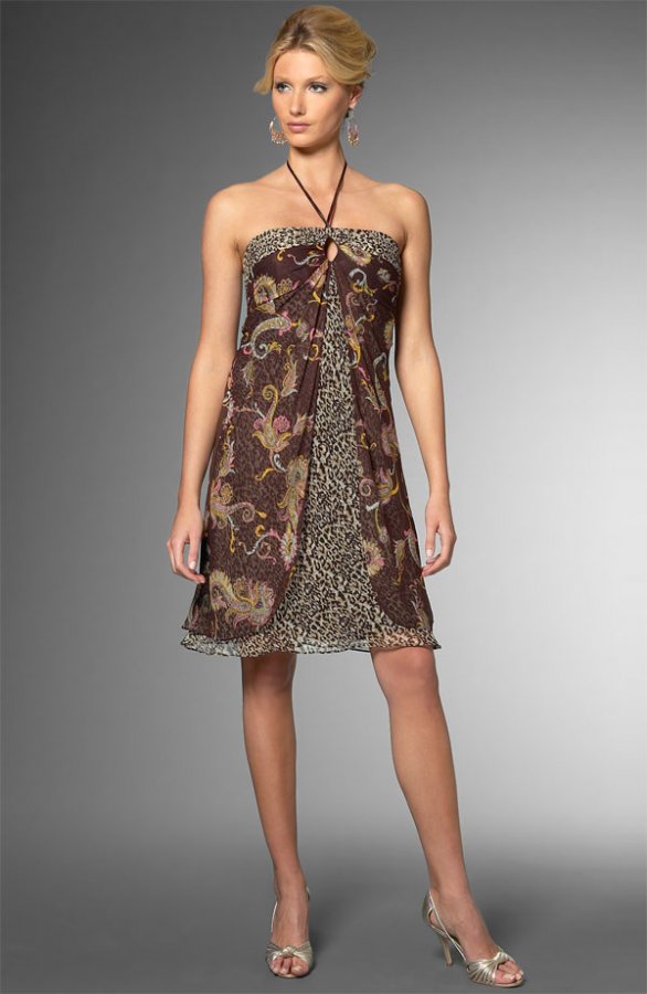 Le tissu de la robe léopard peut être choisi comme dense ou translucide. Les options intéressantes sont celles où l'imprimé léopard est combiné avec des tissus d'autres nuances et textures. Dans ce cas, l'agressivité de l'empreinte dangereuse est quelque peu atténuée.