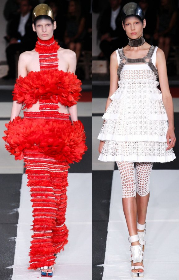Tous les vêtements Alexander McQueen ont une coupe parfaite, une attitude respectueuse envers la beauté - y compris les jeans qu'il a inventés qui glissent jusqu'aux hanches, les vestes kimono avec une taille accentuée, les robes avec corsets en cuir rugueux, les robes Art déco, les capes-capes à capuche et bien d'autres autres choses. Il travaillait autrefois dans des ateliers de théâtre, et aimait donc présenter sa collection sous forme de scénographie avec effets spéciaux. Les vêtements d'Alexander McQueen reflètent les hautes traditions de l'art du design, ils contiennent non seulement de la beauté, mais aussi de nouvelles sensations de la vie.