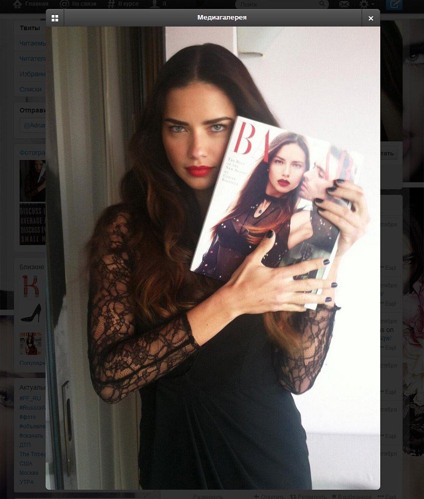 Sur Twitter, une fonction fonctionne également - afficher le code de l'élément, mais je n'ai pas pu trouver de liens vers la photo, j'ai donc dû aller dans l'autre sens. Lorsque la photo est ouverte, cliquez sur le bouton d'impression d'écran. Ensuite, ouvrez un éditeur graphique. Vous avez sûrement installé Photoshop sous licence sur votre ordinateur, alors utilisez ce merveilleux programme, où vous devez créer un nouveau fichier, puis sélectionnez l'élément de menu - insérer. Il ne reste plus qu'à recadrer la photo et vous pouvez l'envoyer à la collection pour une visualisation personnelle.