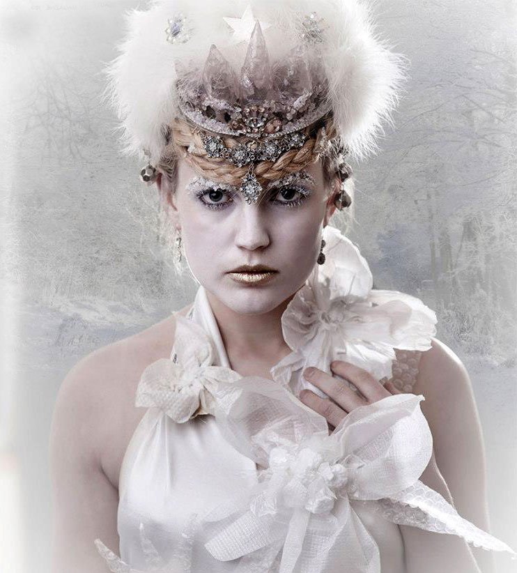 S'il n'y a pas de cristal de roche, vous pouvez utiliser des guirlandes de Noël - pluie scintillante et flocons de neige. Les perles et la fourrure blanche et blanche seront d'une bonne aide pour créer l'image. Et bien sûr le maquillage correspondant dans le style de la Reine des Neiges.