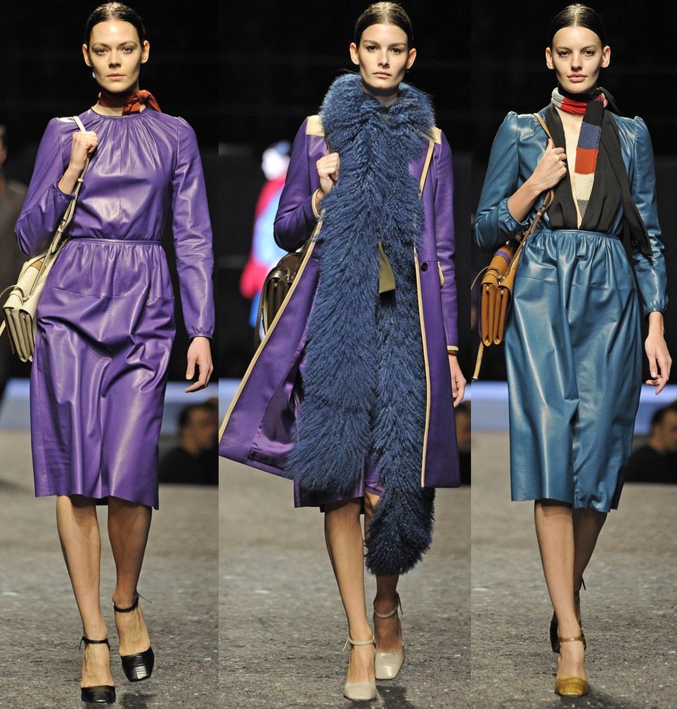 Et les filles ont présenté des robes en cuir sous le genou aux couleurs vives, des vestes, des robes en laine fine, des chemisiers transparents et des manteaux avec des boas en fourrure duveteuse.