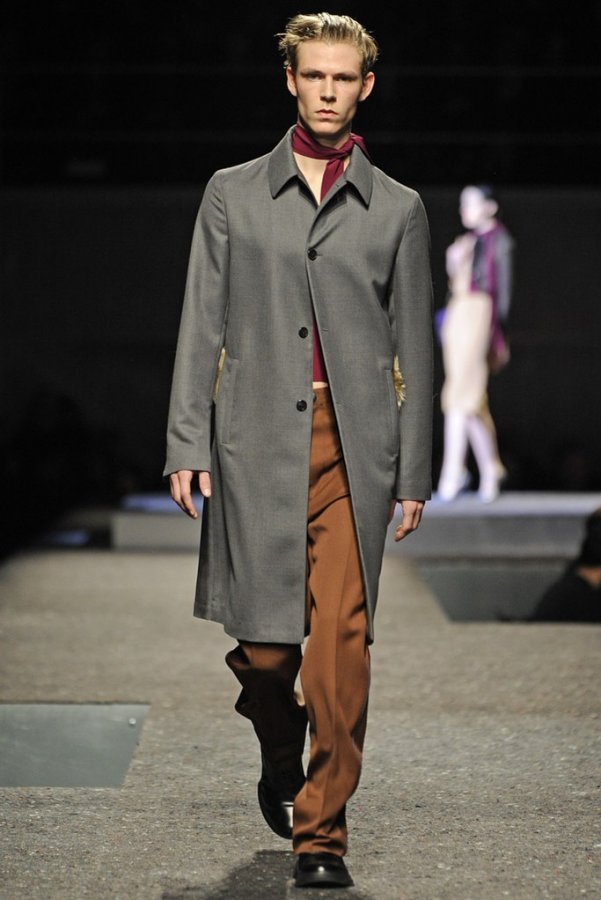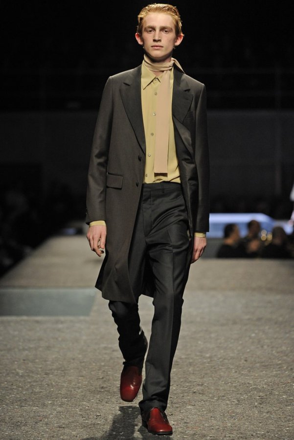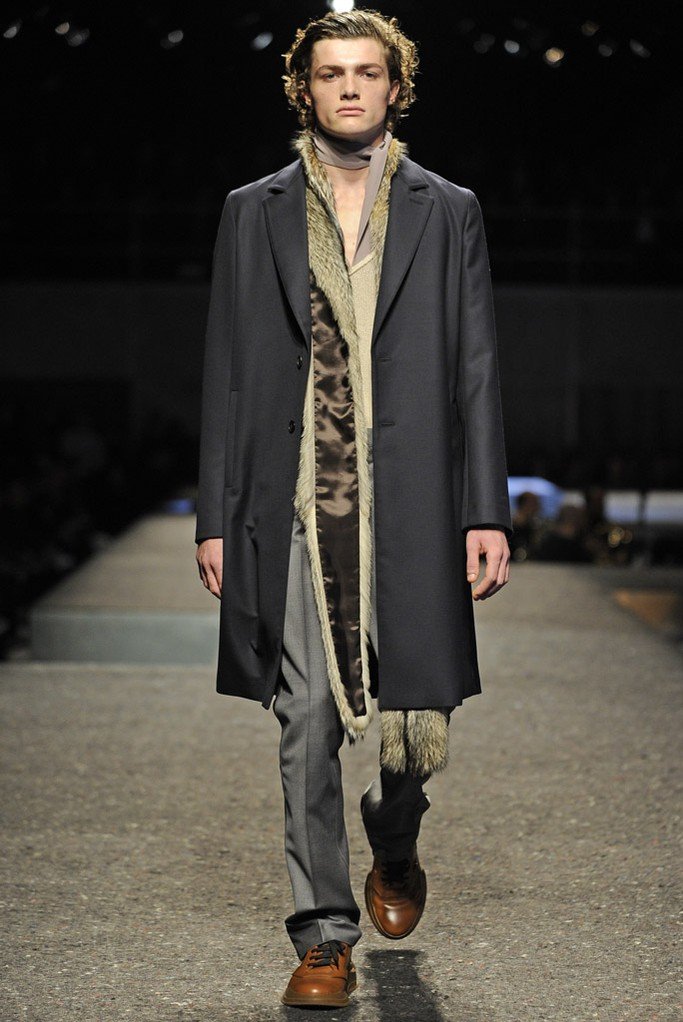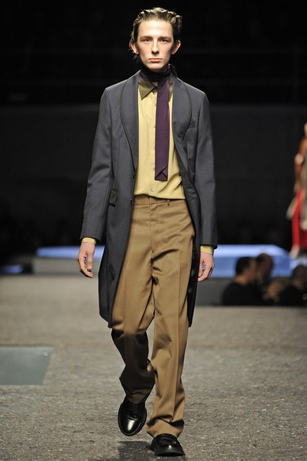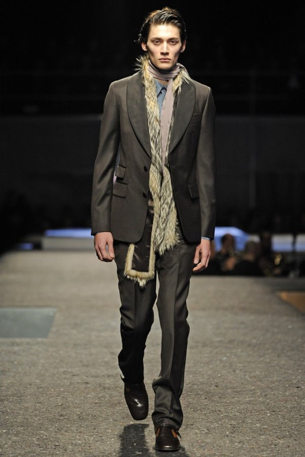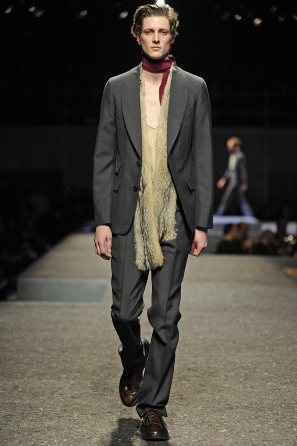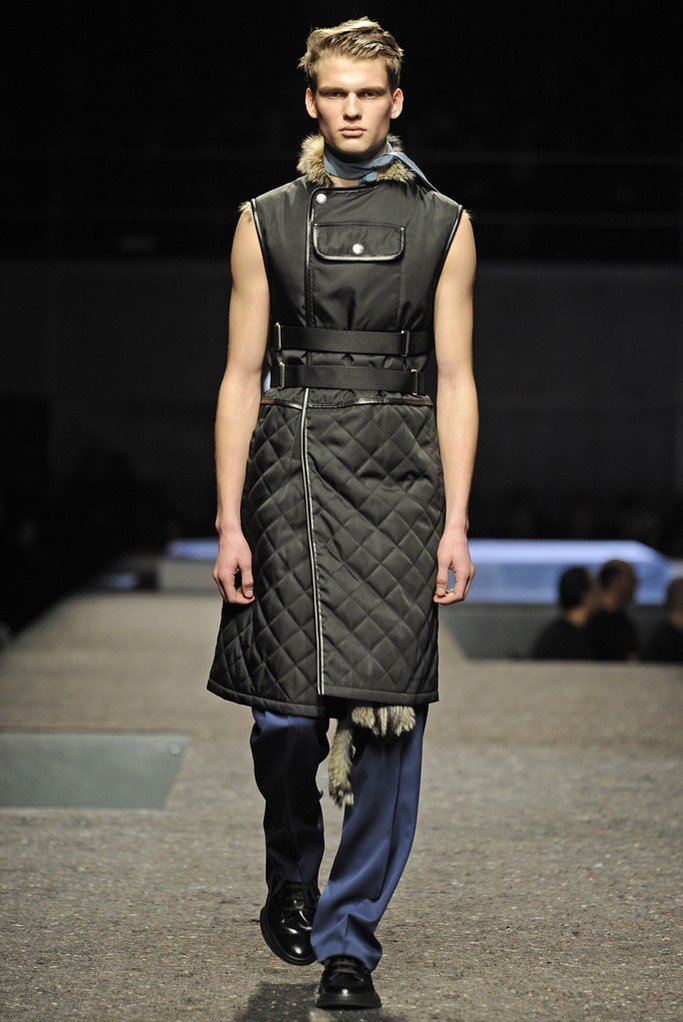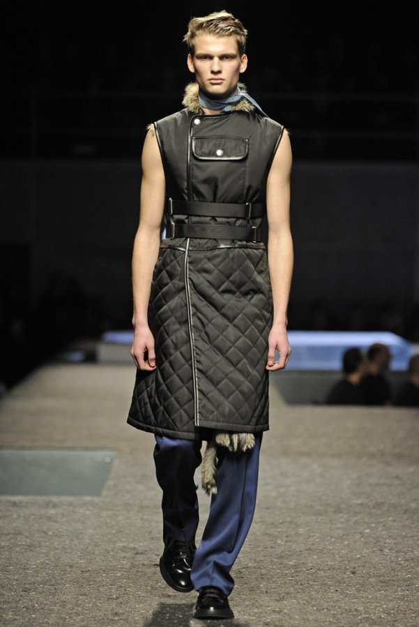 En plus des costumes traditionnels, l'homme Prada portera des gilets en fourrure et des manteaux matelassés sans col pour l'hiver 2025-2026. Normalement Miuccia Prada prêté attention aux détails, ne faisant pas de liens sur le cou des modèles de manière traditionnelle, mais simplement en les nouant sur le côté.