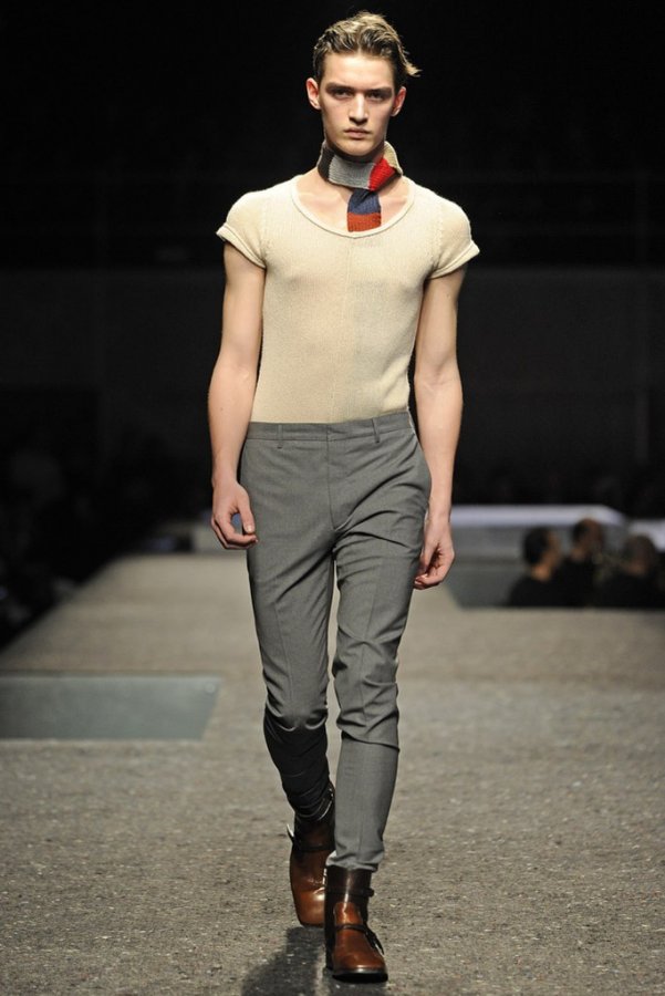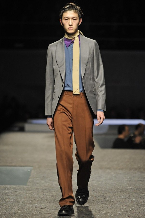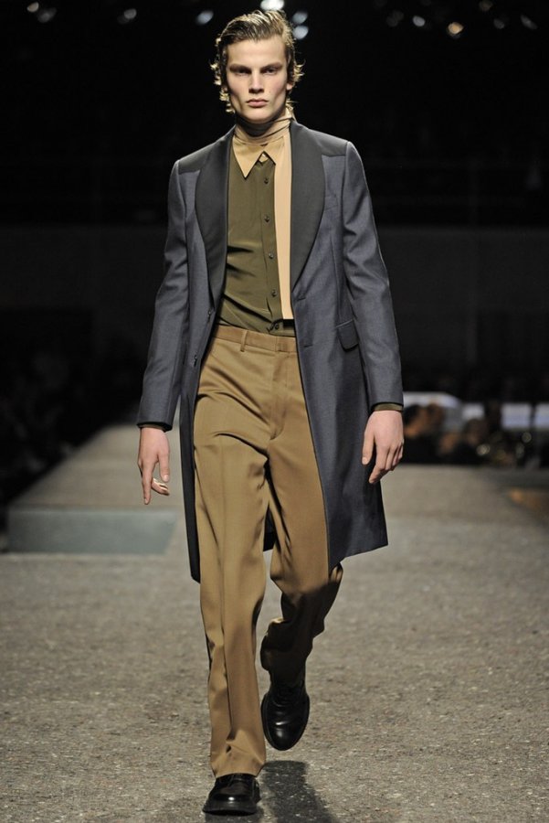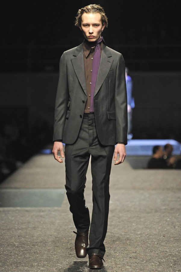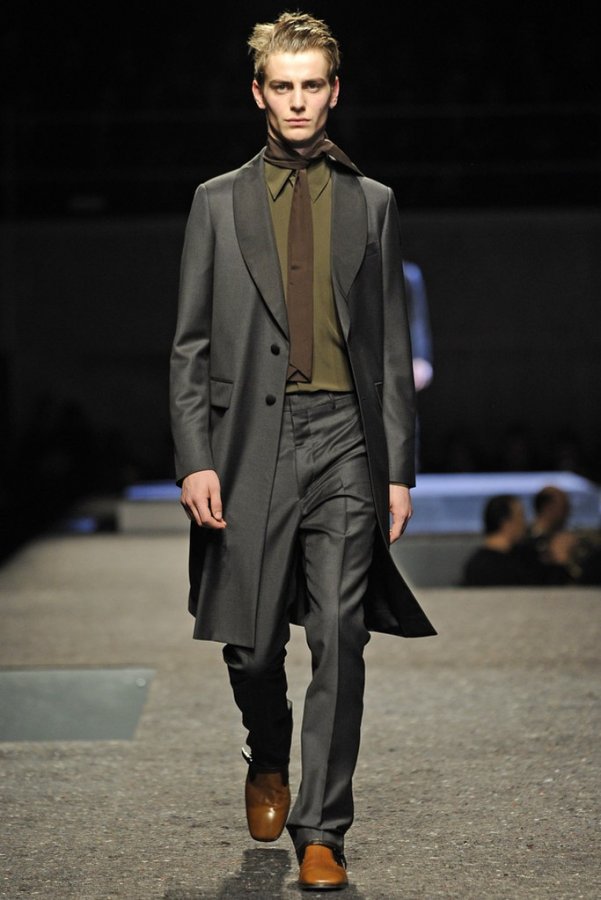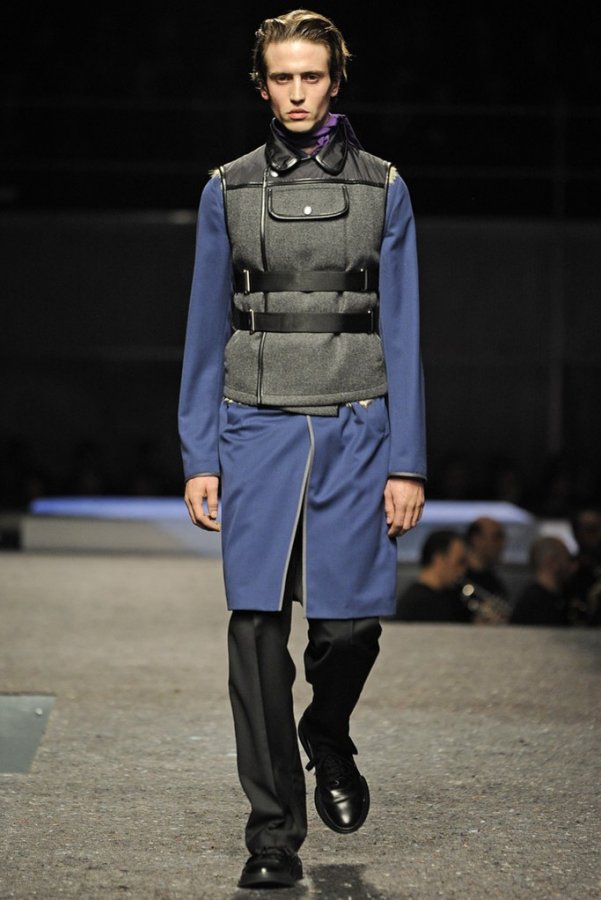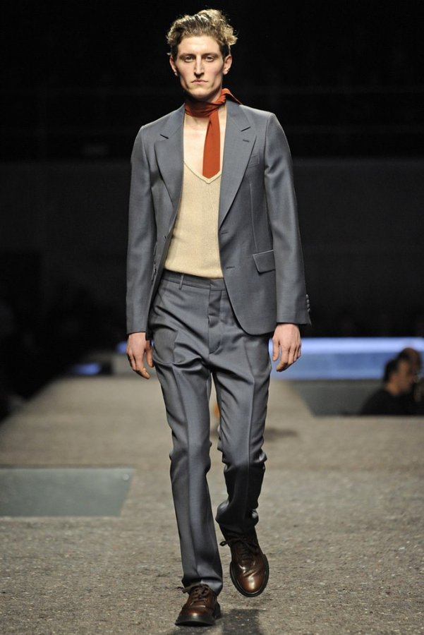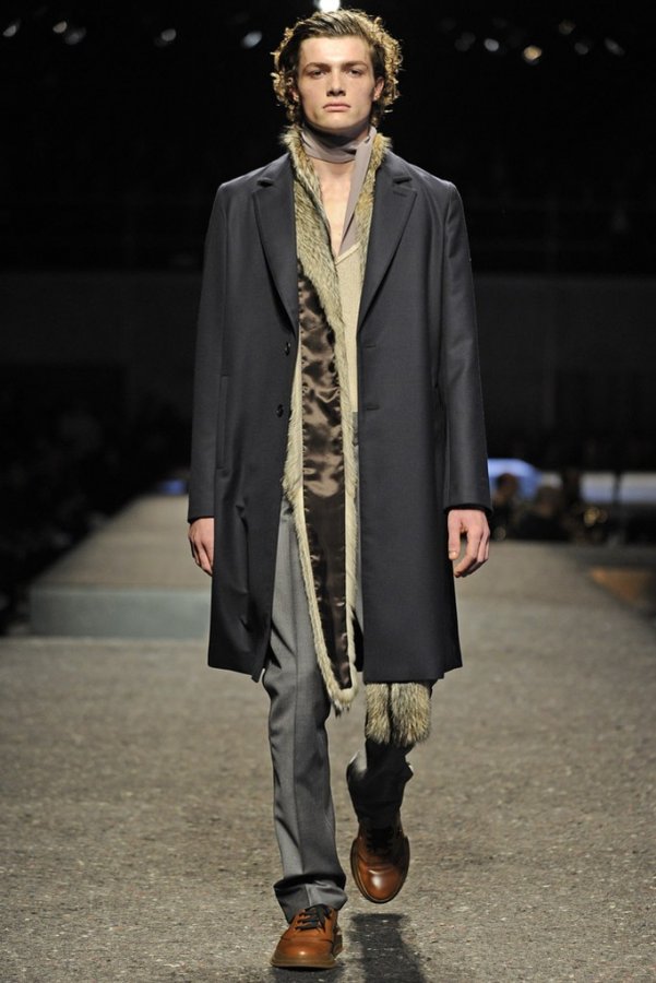 En plus des costumes traditionnels, l'homme Prada portera des gilets en fourrure et des manteaux matelassés sans col pour l'hiver 2025-2026. Normalement Miuccia Prada prêté attention aux détails, ne faisant pas de liens sur le cou des modèles de manière traditionnelle, mais simplement en les nouant sur le côté.
