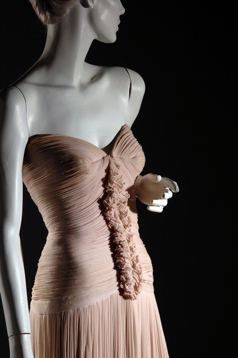 Robe 1955. Robe en mousseline de soie dont chaque pli est attaché à un corset rigide en os. La couture à la taille et la double couture sous la poitrine sont en mailles courtes. De cette façon, ces coutures maintiennent le pli en place. Sous le buste, les bonnets du corsage sont divisés, ce qui est fait si magistralement qu'il attire l'attention sur le décolleté. Les fines bretelles ajoutent féminité et charme. Pour réaliser cette perfection, il a fallu un métrage impressionnant de tissu : il s'avère que 2,8 mètres de tissu ont été transformés en 7 cm lors du processus de draperie.