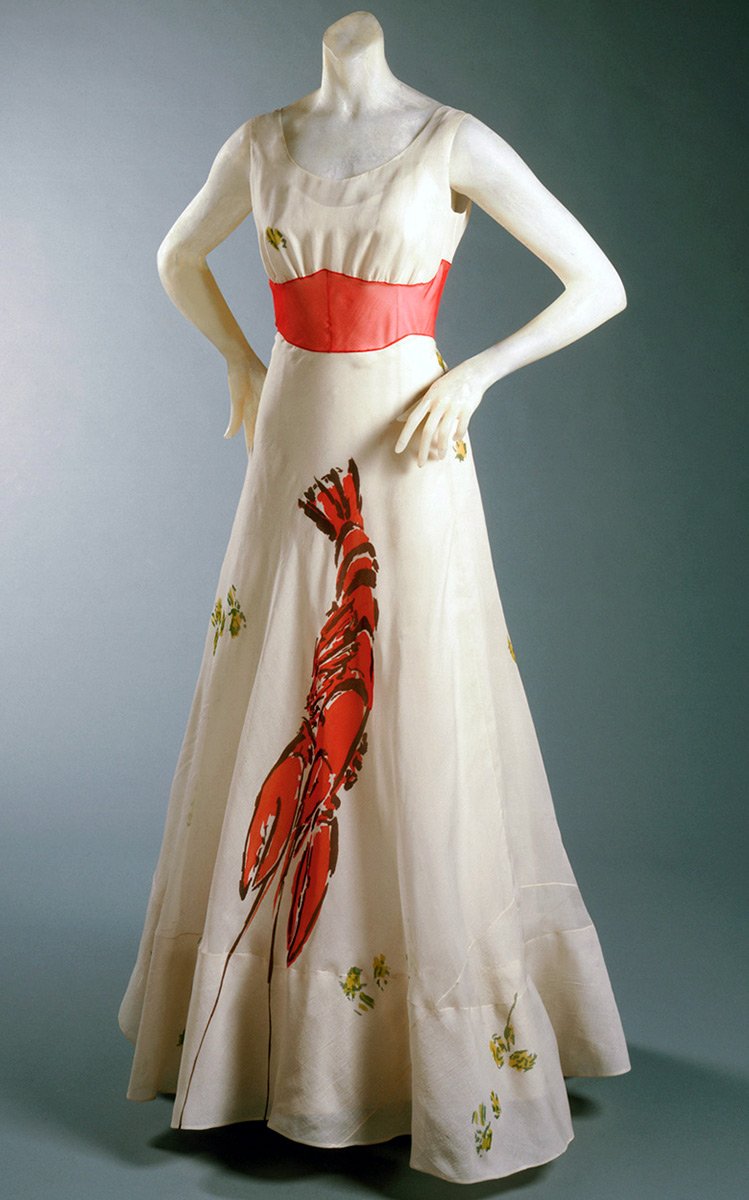 Elle a imaginé toute une série d'articles dans le genre surréaliste, dont une robe avec un homard. Robe longue au sol avec une coupe profonde en organza blanc, finie avec des volants à l'ourlet, le corsage est froncé avec une ceinture en trompe l'œil. À première vue, la robe semble être dans un style traditionnel. Mais sur la jupe, il y a un insert en tissu avec un homard, qui est situé de manière à rétrécir visuellement la taille.
