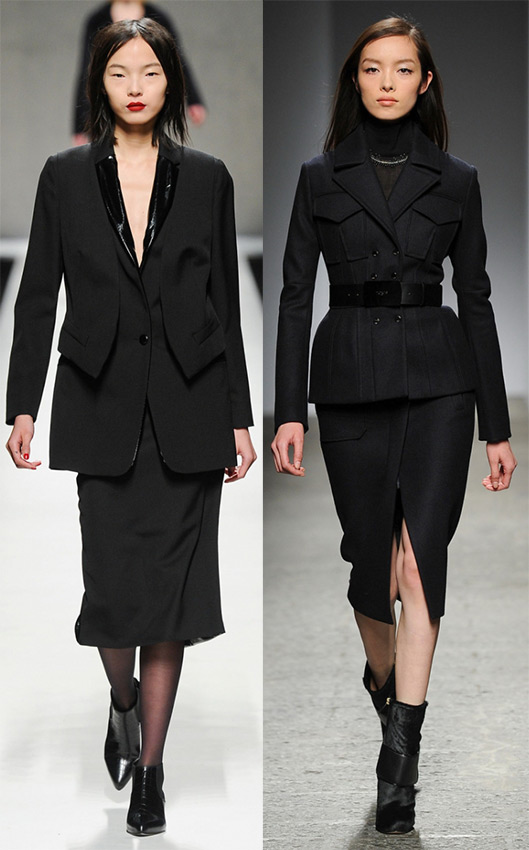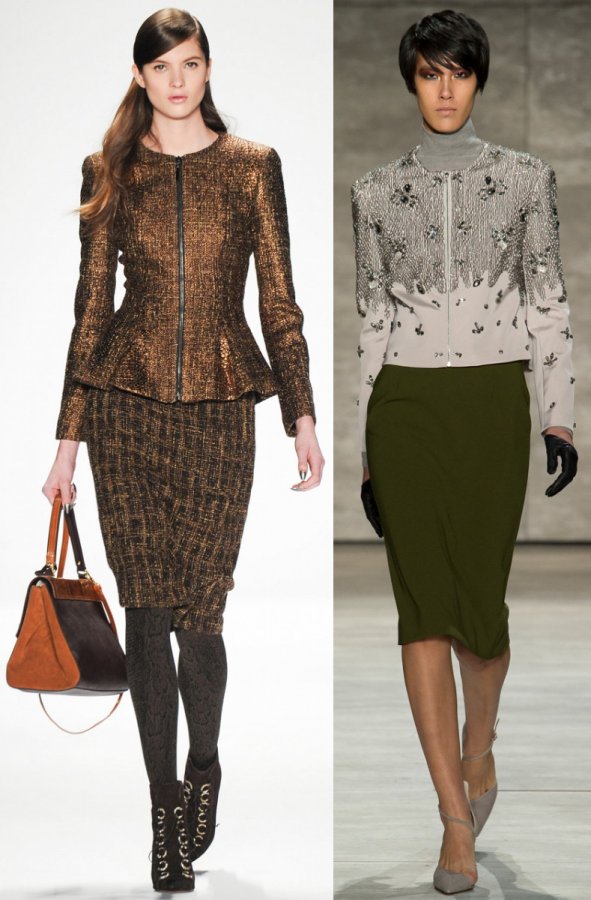Lorsque vous commencez à choisir un costume, commencez par une jupe - d'une jupe crayon moulante à une jupe avec des fronces à la taille ou des plis. Passez ensuite à la veste, qui doit équilibrer la forme de la jupe. Si la jupe est volumineuse, choisissez une veste moulante. Si vous souhaitez une veste plus expressive, par exemple avec un basque, choisissez une jupe étroite et stricte. N'oubliez pas la longueur de la jupe. C'est un détail important. Vous ne pouvez pas vous tromper si votre jupe est juste au-dessus du genou, jusqu'au genou ou juste en dessous du genou.Une jupe longue dans un costume est une option rare pour décorer une silhouette, et une minijupe dans de nombreux cas ne convient pas à un bureau.