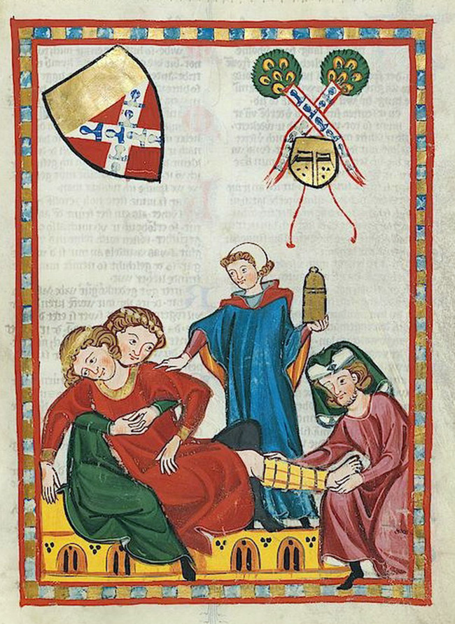 Une attelle sur une jambe cassée. Miniature du Codex Manesian.