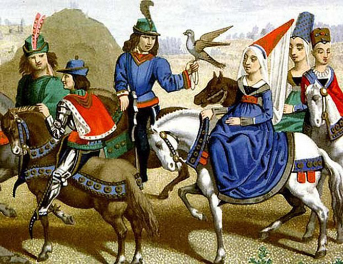 Exactement les mêmes allongés et pointus que les cathédrales, étaient les vêtements des habitants de l'Europe gothique médiévale. Ils portaient des chapeaux allongés et pointus, des chaussures à bouts pointus et allongés, des robes qui allongent la silhouette. Mais en même temps, les couleurs des vêtements, comme auparavant, restaient très vives - bleu, jaune, rouge.