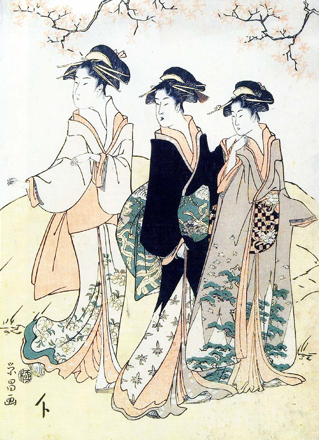 Trois beautés à l'ombre d'une cerise. Chokosai Eisho. Période Edo (fin XVIIIe siècle).