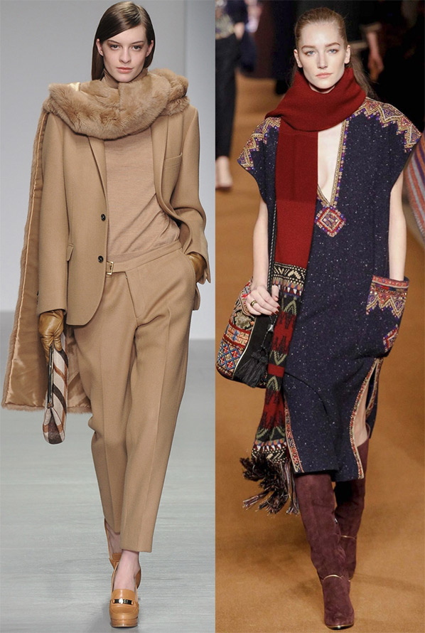 Pas seulement écharpes tricotées, mais aussi des écharpes en cachemire, les fourrures sont devenues l'objet d'attention des créateurs. Ils sont assez longs et larges, vous pouvez vous envelopper dedans et vous cacher du froid même dans un costume léger. Les écharpes tricotées à motifs restent populaires.