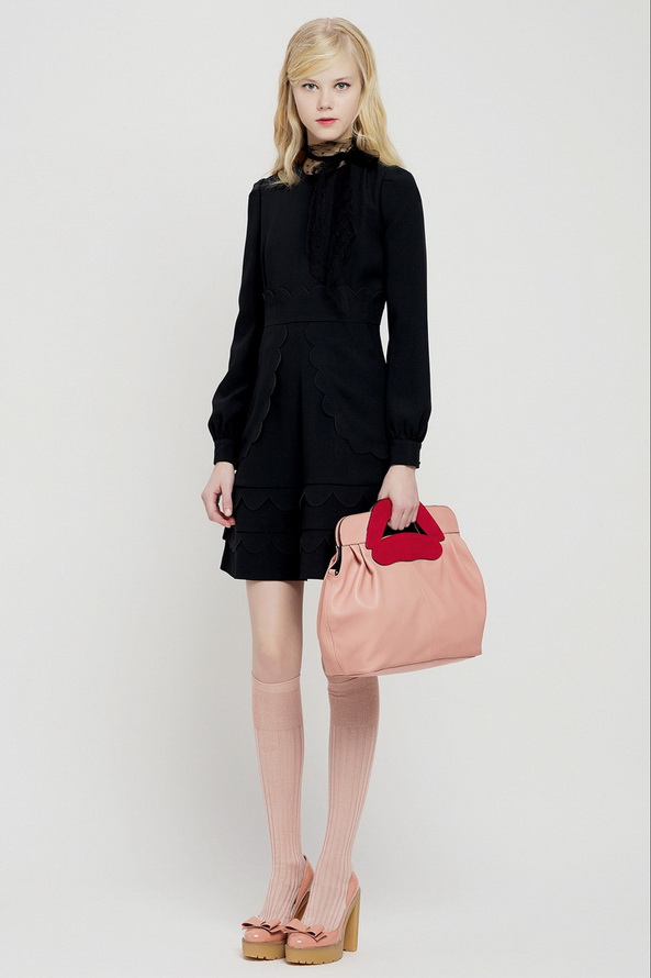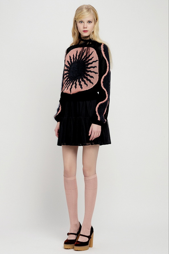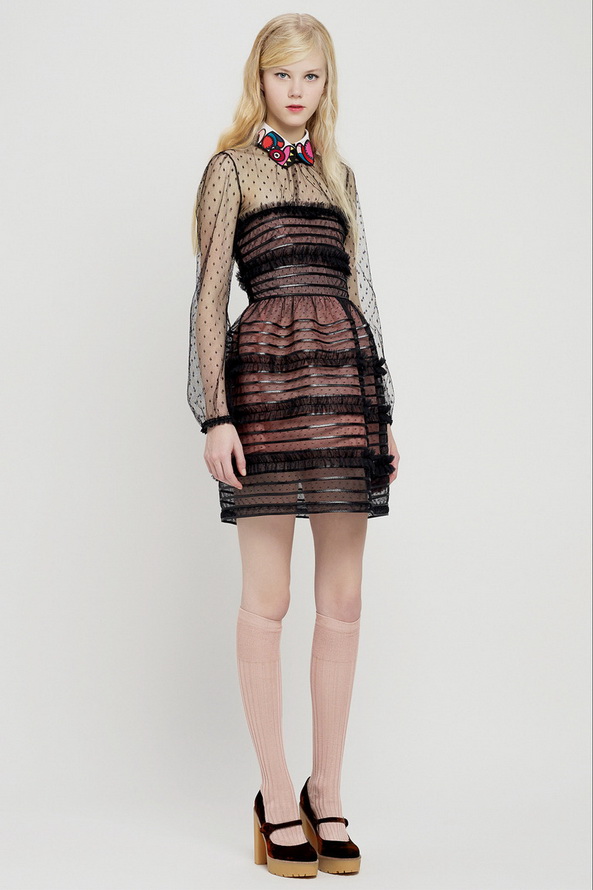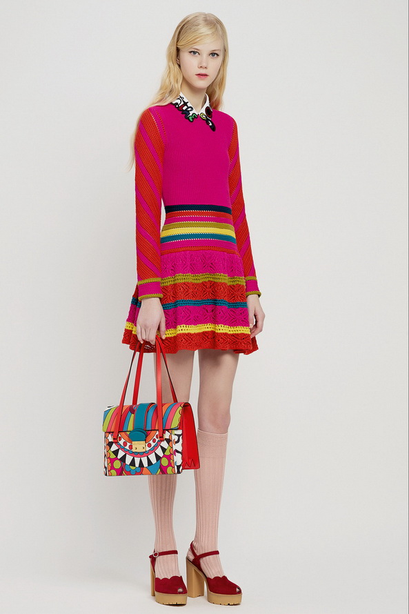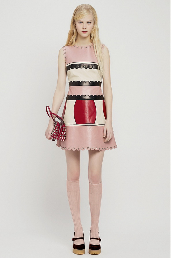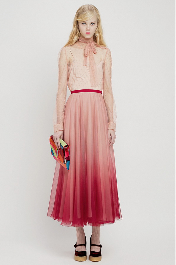 La nouvelle collection pré-automne hors saison pour l'automne et l'hiver de Red Valentino est très riche, nous pouvons voir ici diverses robes et jupes, chemisiers en mousseline de soie, organza, dentelle, cuir et autres matériaux. Vieillies dans le style des années 60, les jupes courtes et les robes trapèze sont décorées de divers imprimés floraux et pop art.