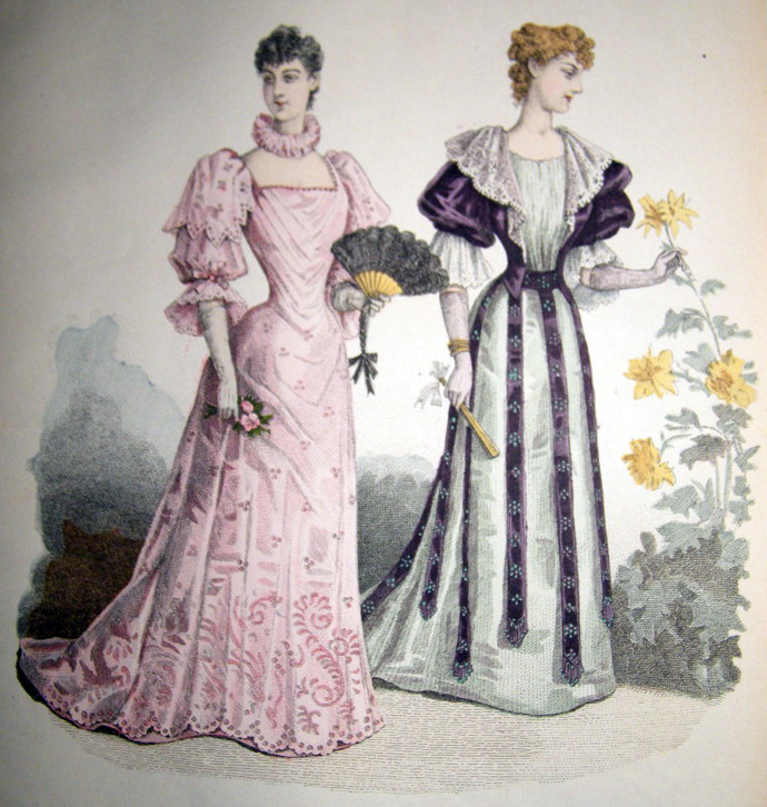 Les robes de soirée étaient souvent confectionnées sans manches, avec un décolleté profond. Au lieu de manches, un drapé léger a été créé à partir de tissu ou de dentelle, de fleurs artificielles ou de plumes. La taille de guêpe suggérait le port obligatoire d'un corset.