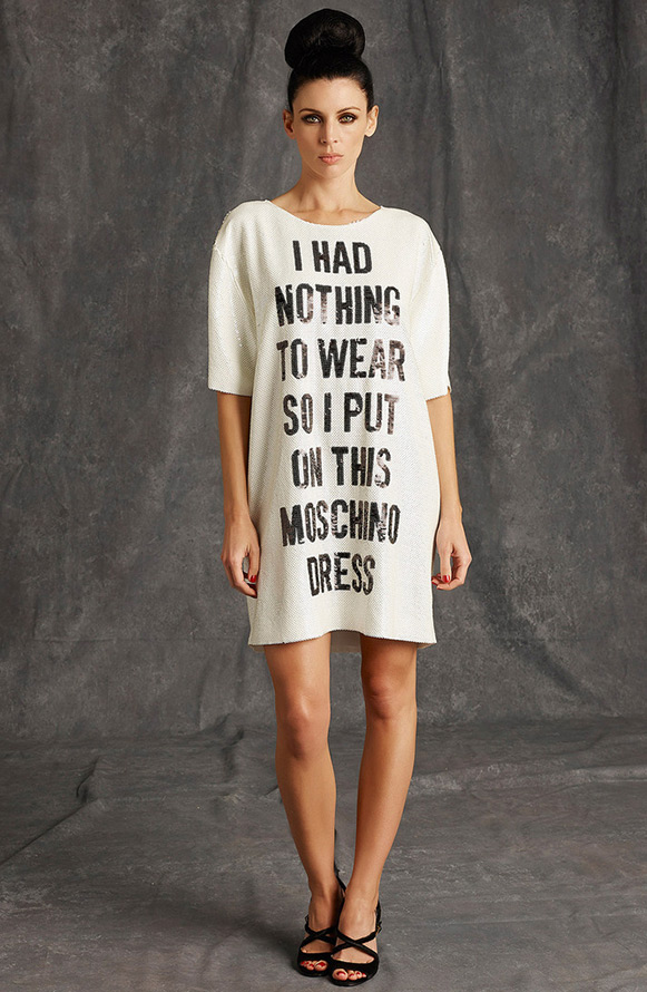 Outre divers dessins, ce n'était pas sans messages sous forme de textes. Il y a des inscriptions dans la collection "petite robe noire", et le texte "Je n'avais rien à porter, donc je suis dans cette robe de soirée chère de Moschino".