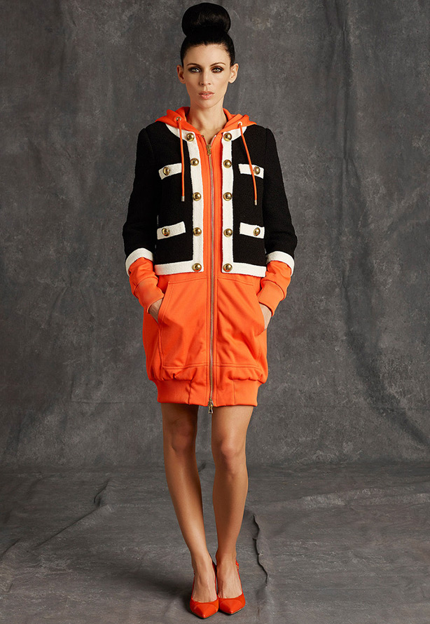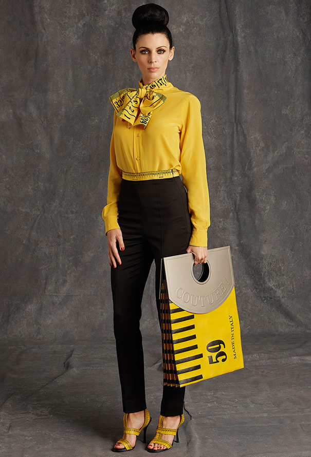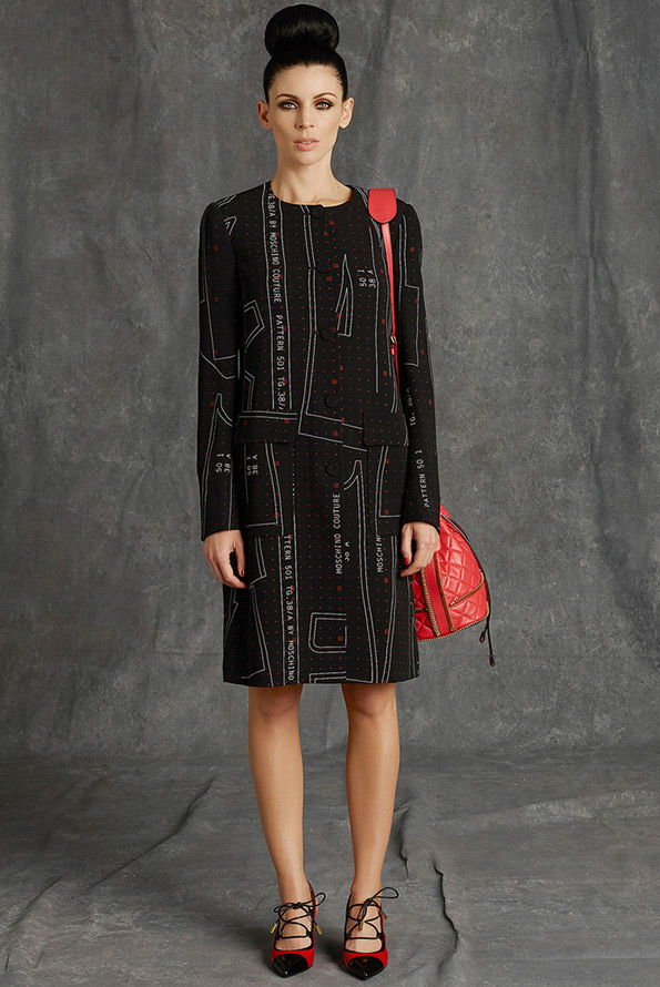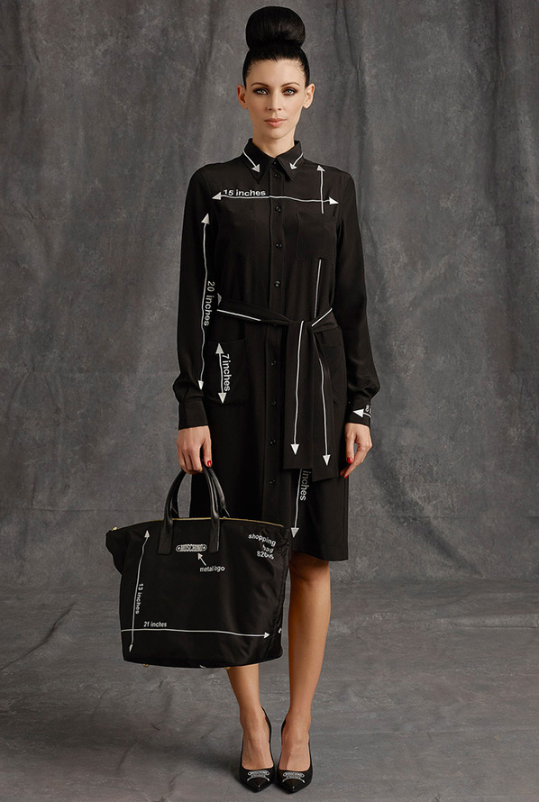 Dans cette collection, le designer Jeremy Scott a poursuivi le thème de la mode ironique qui a fait la renommée et le succès de la marque. Sur les vêtements, on peut voir des empreintes en forme de centimètre, des imitations d'empreintes en fer, des empreintes avec des cintres, des signes d'entretien des vêtements, des motifs ressemblant à des symboles et des lignes de coupe d'un vêtement inachevé appliqués avec de la craie ou un morceau de savon, et d'autres si familiers au monde de la mode.