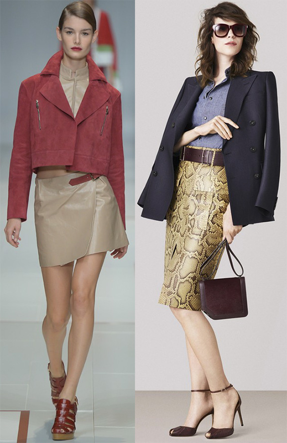 Les jupes en cuir seront un excellent ajout à une veste en daim, un chemisier en coton ou en mousseline de soie. Mais n'oublions pas que l'été est à venir, les designers ont donc proposé des combinaisons intéressantes de divers tissus imitant le cuir, qui se marient bien avec des hauts courts.