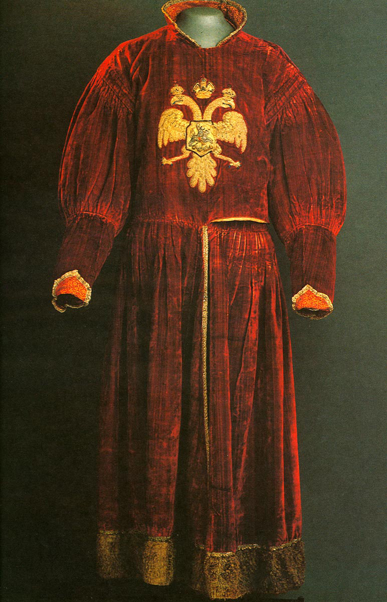 En 1570, les ambassadeurs allemands, se régalant à Ivan le Terrible, notèrent que le tsar et son fils Ivan Ivanovitch étaient vêtus de luxueuses tenues de velours ornées de pierres précieuses et de perles. Ivan le Terrible et son fils étaient tous deux équipés pour la guerre d'un luxe hors de toute mesure. Colliers - des "colliers" faits de matériaux coûteux, brodés de soie, décorés de pierres précieuses et de perles ont été cousus aux vêtements de dessus. Les bonnets étaient en velours. Le tsar Ivan le Terrible lui-même en avait plusieurs. Les bonnets garnis de différentes fourrures étaient en velours vénitien.
