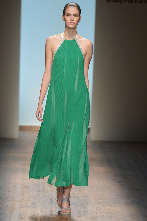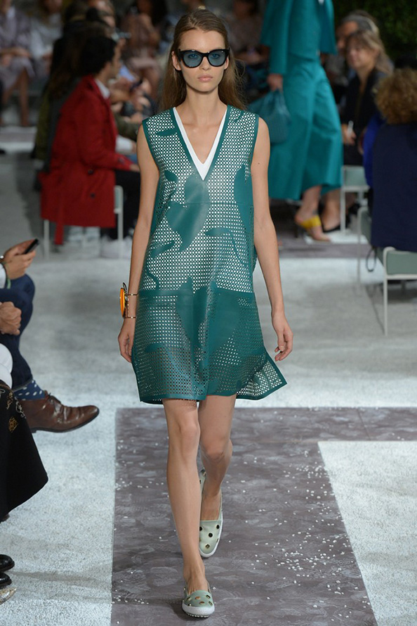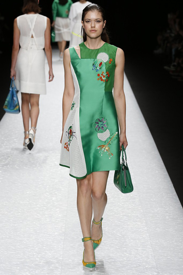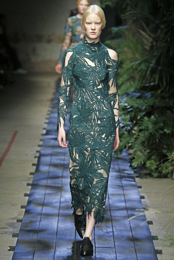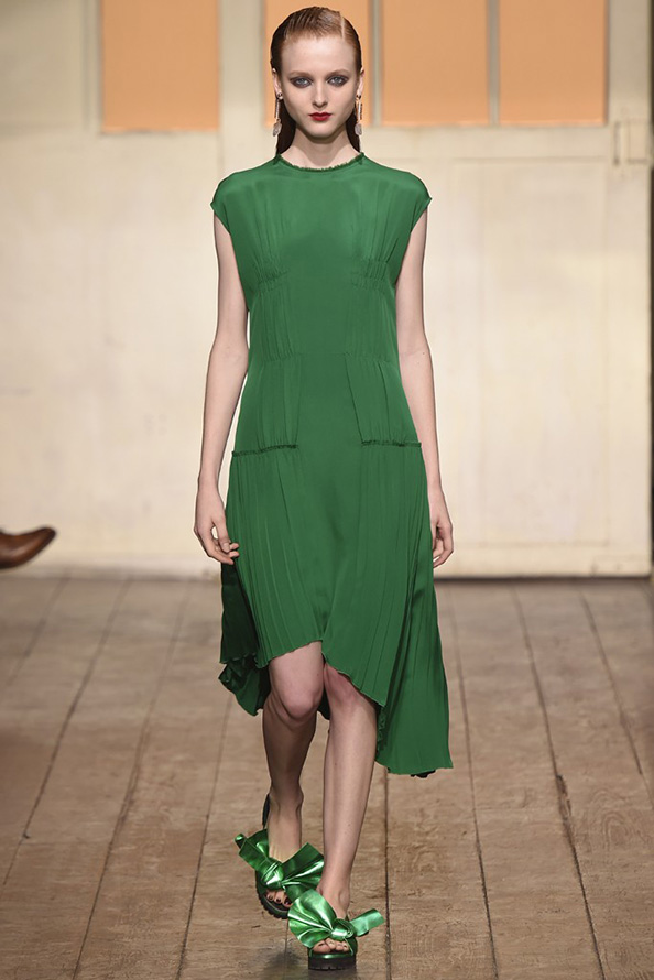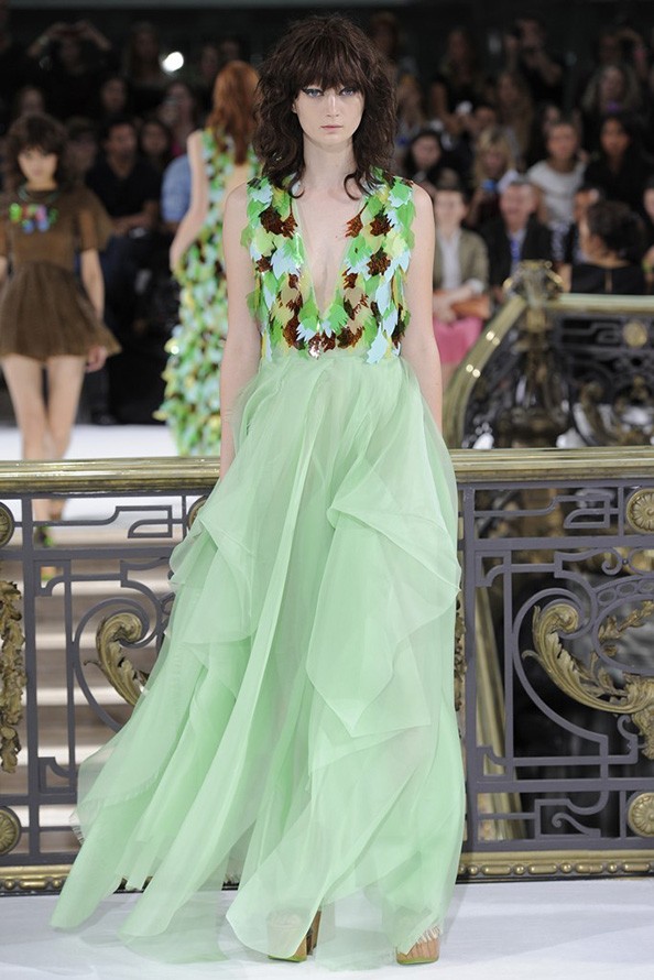 Gucci propose une robe en cuir de luxe, tandis que Giles propose une robe verte étincelante aux couleurs volumineuses et bidimensionnelles. La collection Tods a une robe verte perforée, tandis que John Galliano a des robes longues et aérées qui symbolisent littéralement le printemps.