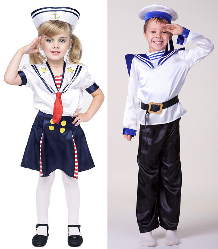 Le costume de marine pour les filles se composait d'une veste avec le même col et une jupe plissée, et bien sûr le même béret qui ornait la tête des enfants. Les costumes sur le thème maritime sont devenus populaires, et comme les uniformes des marins de chaque pays étaient différents, les costumes des enfants correspondaient à leur lieu de résidence.