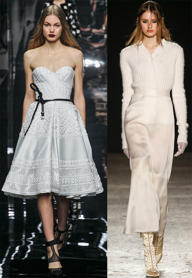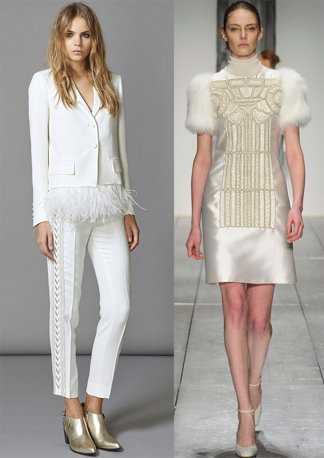 Le blanc est un fond idéal pour la broderie, la broderie sera particulièrement belle - Gjel, mais l'ourlet peut rivaliser avec lui, et la surface de trépointe anglaise. Les dentelles, les volants, les volants, les laçages, les paillettes d'or et les strass dans les tenues blanches sont luxueux, et la fourrure blanche n'est pas seulement du luxe, mais aussi de la magie. Soit dit en passant, la décoration avec des détails en fourrure au cours de la saison 2025-2026, non seulement des manteaux et des vestes, mais aussi des robes est l'une des principales tendances.