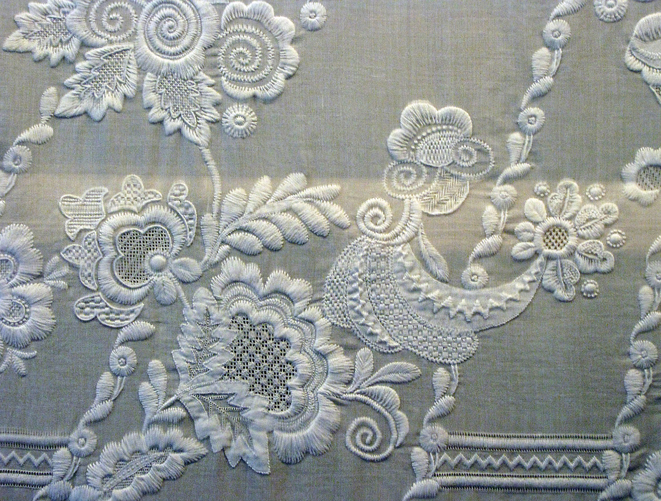 Anglais blanc lisse appartient aussi à peu près au même genre de broderie, mais ici tout de même, les trous et les festons prédominent. Presque tous les motifs sont des brindilles avec des feuilles en forme de trous, coupées autour d'un point de bourdon. Cette surface est appelée - Travail blanc anglais - " whitework " ou " Broderie Anglaise " - " Broderie anglaise ". Cette broderie était extrêmement populaire en Angleterre au 19ème siècle, bien qu'on pense qu'elle est originaire du 16ème siècle en Europe de l'Est.