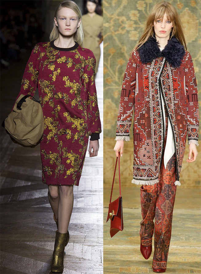 Impressions de meubles tels que de vieux monogrammes sur des fauteuils moelleux ornaient des robes et des manteaux. On dirait que Dries Van Noten a décidé de transformer le rembourrage en une impression. La tapisserie d'ameublement est également présente dans la collection Tory Burch. Les couleurs intérieures sont gaies, impressionnantes et, comme c'est typique pour elles, elles sont chaleureuses et confortables.