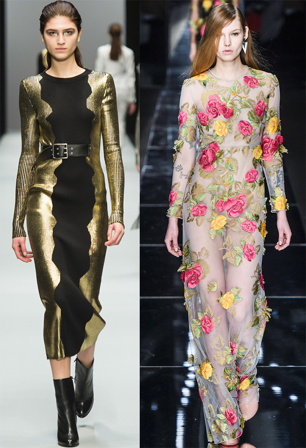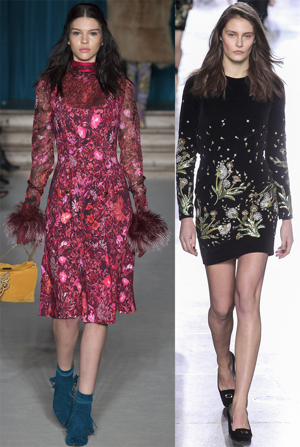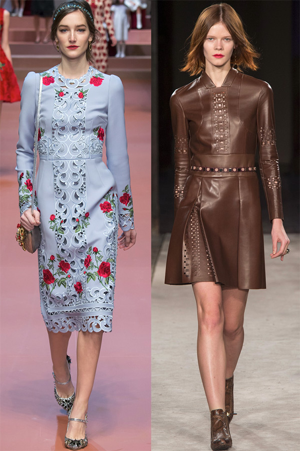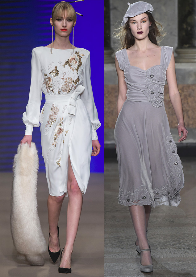 Les franges, les perforations, les laçages et les garnitures en fourrure, et en particulier les garnitures en fourrure colorée, peuvent être utilisés dans une variété de styles et de looks. La technologie 3D reste d'actualité, mais toujours plus calme que la saison dernière. Des fleurs volumineuses se confondent avec des broderies découpées, des appliques. Choisissez des accessoires monochromes et classiques pour ce type de décor.
