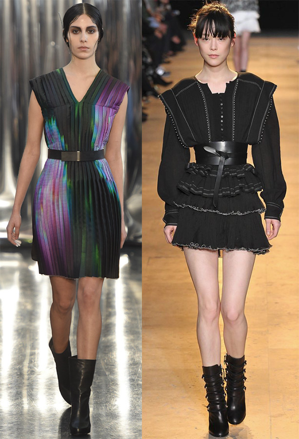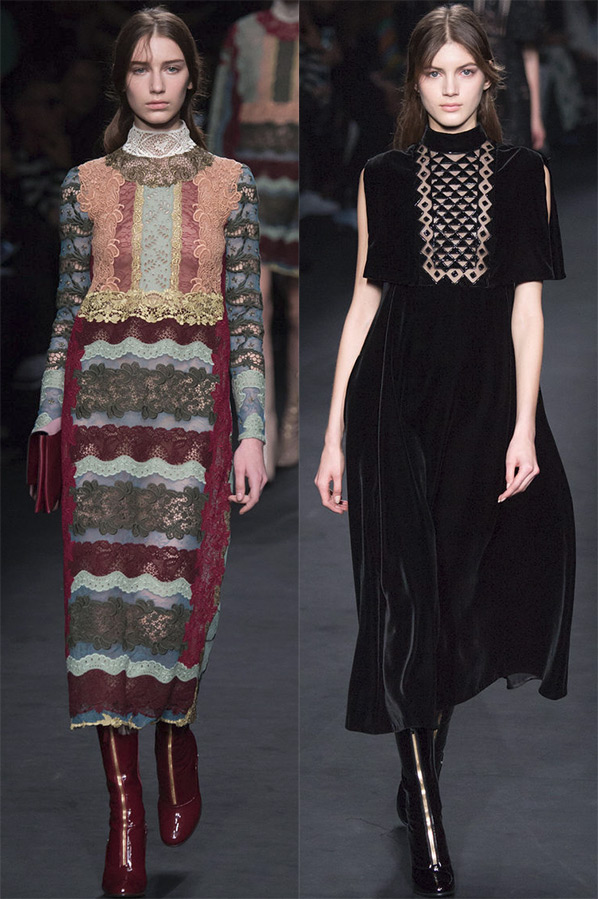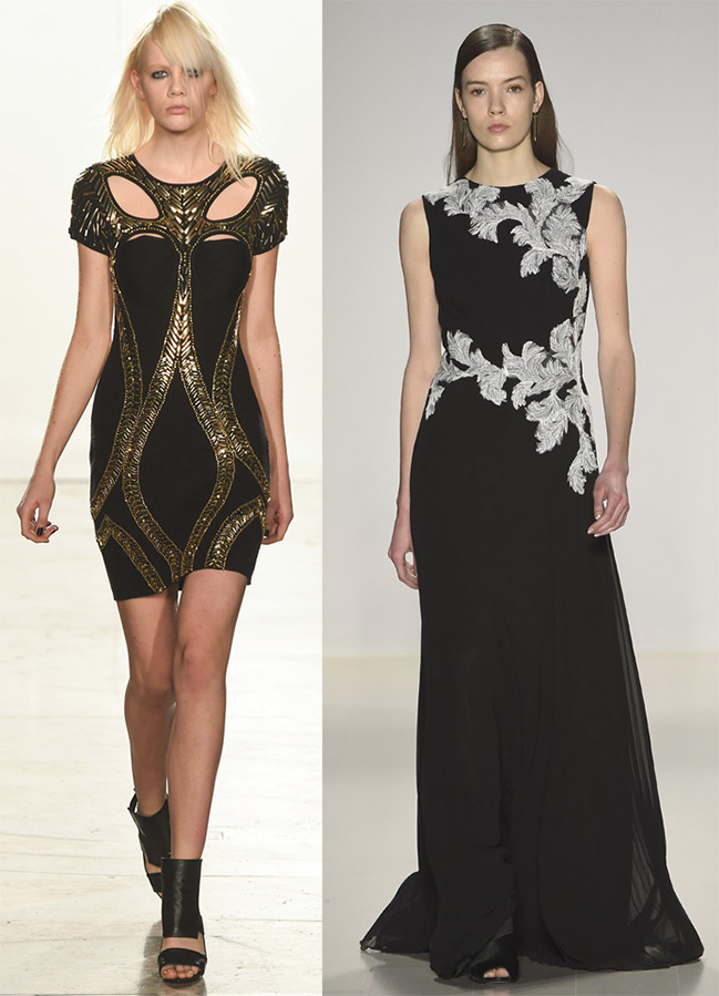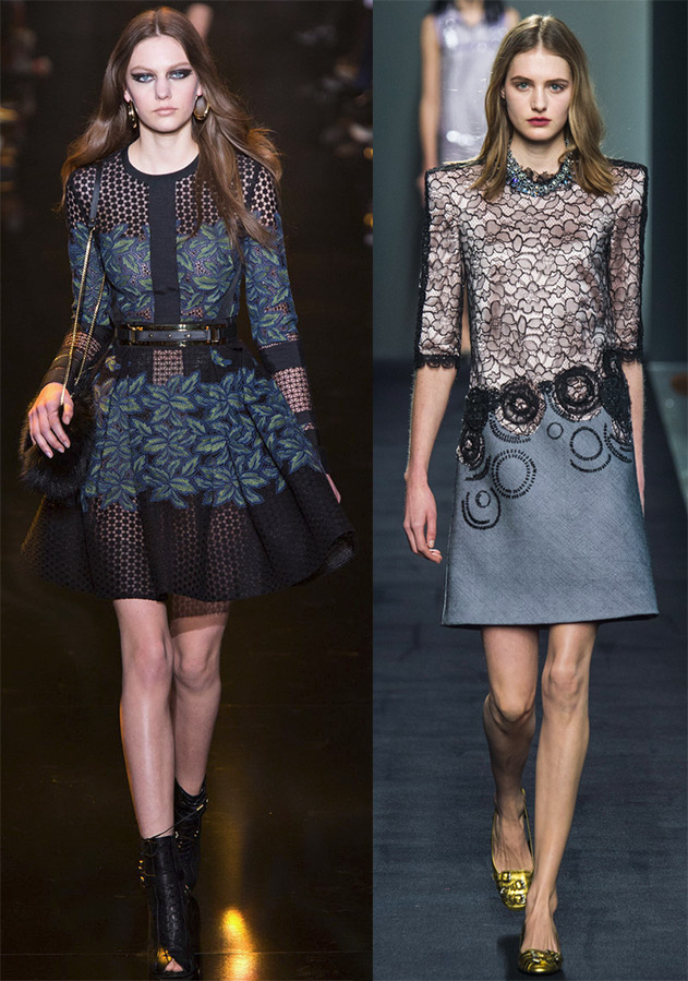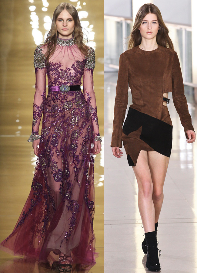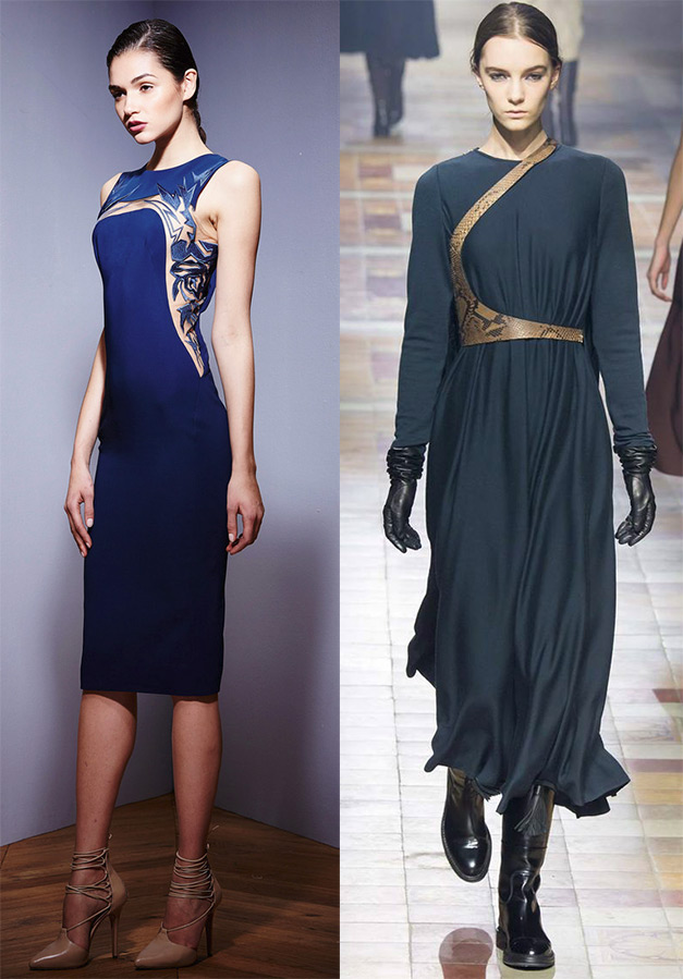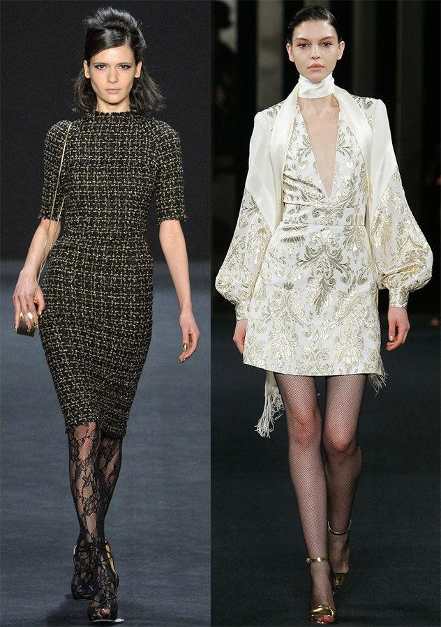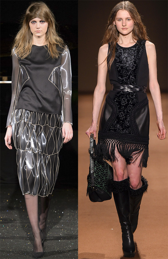 Certains designers ne cessent de conquérir le style gothique du Moyen Âge sombre. Nicholas K offre une coupe de vol libre et le style militaire préféré de tous. La mode pour les coupes, d'ailleurs, nombreuses, l'asymétrie et la superposition restent les plus appréciées des créateurs. C'est ici que se manifeste un fantasme violent, dans lequel il est difficile de voir les contours de la silhouette. Comme toujours, les classiques sont d'actualité - une silhouette droite, ajustée (princesse, cocktail), avec différentes longueurs de mini à maxi.