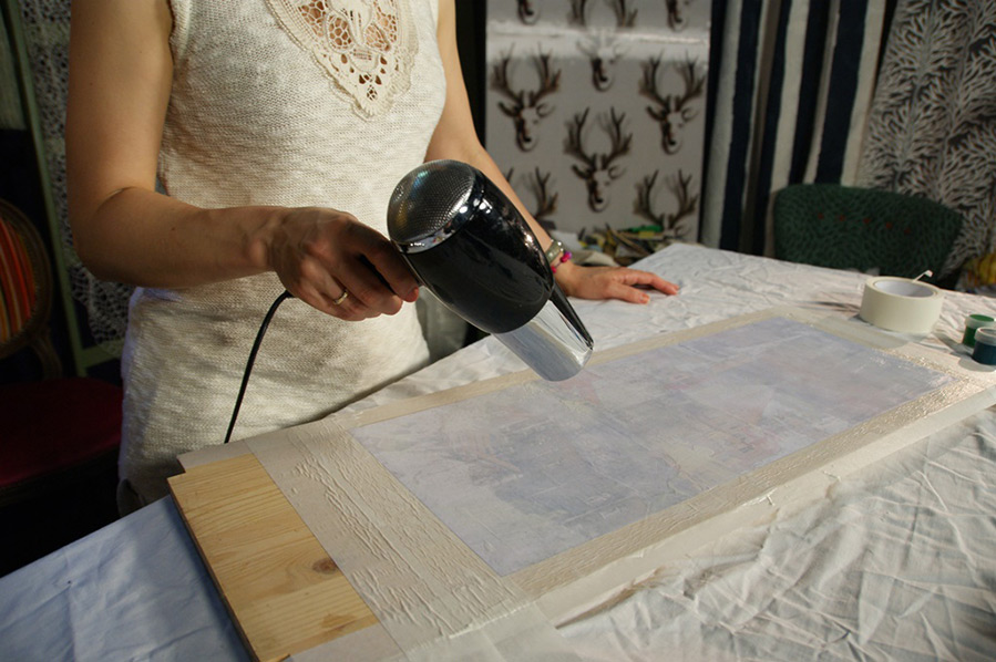 Nous éliminons l'air, lissons et pressons l'image avec un rouleau de construction ordinaire. Ensuite, nous le séchons avec un sèche-cheveux pour que la colle "se grippe".