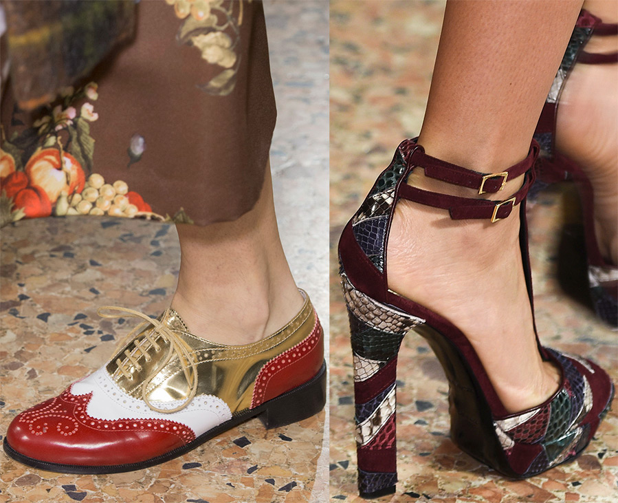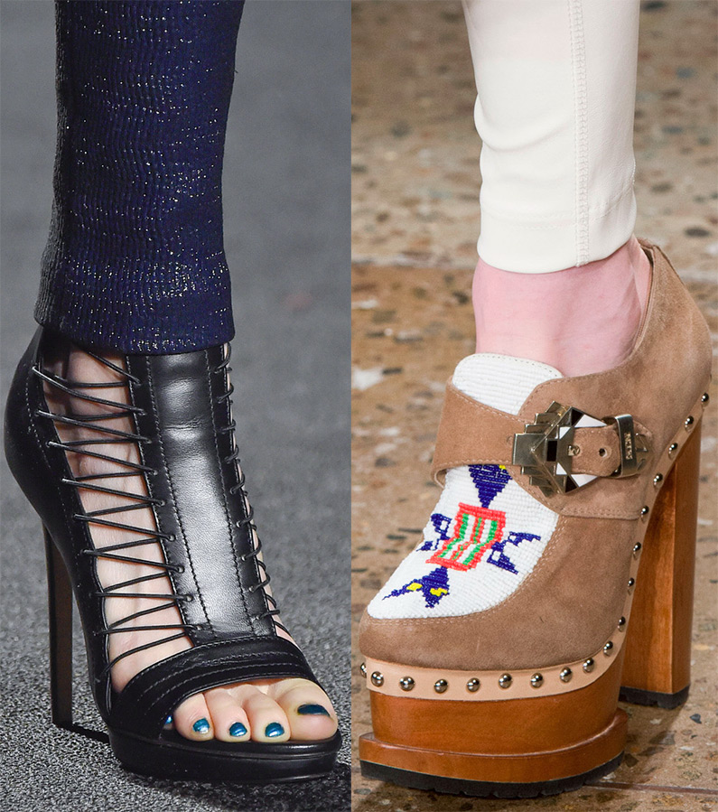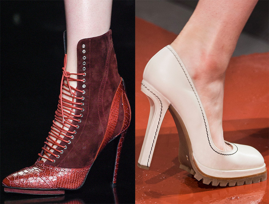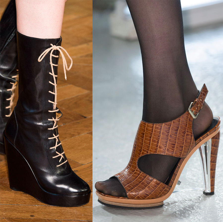 La plate-forme haute dans l'orteil de la chaussure équilibre talon haut, qui peut être une épingle à cheveux ou un poteau éternel. Vous pouvez voir une grande plate-forme solide double ou empilée. Les designers Antonio Marras et Alexander Wang l'ont sérieusement démontré sur le podium. Les talons hauts et les talons larges étaient préférés par Marc Jacobs et Mulberry.