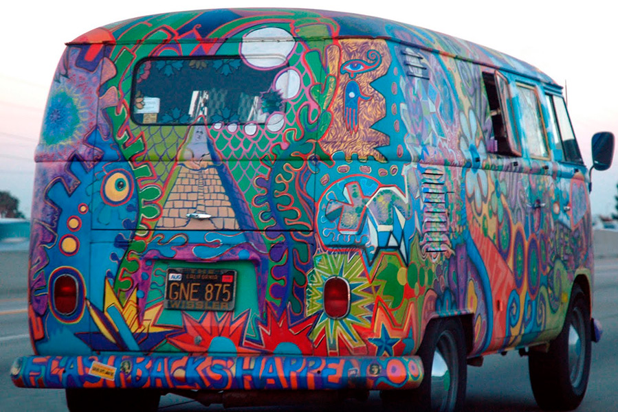 Les couleurs sont vives, très souvent de nature psychédélique, car les hippies n'avaient rien contre la marijuana, le LSD et d'autres substances qui élargissent la conscience. C'est-à-dire que dans les couleurs des vêtements, il y a des cercles concentriques de toutes les couleurs de l'arc-en-ciel et des formes irrégulières, des motifs étranges et des fractales de nuances vénéneuses.