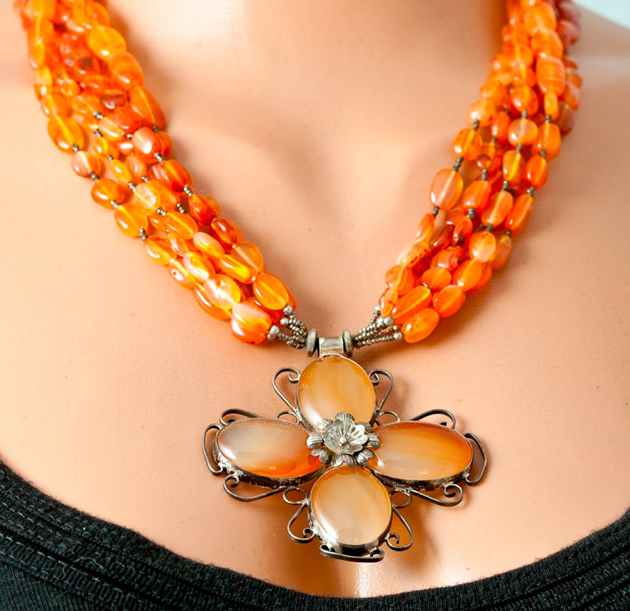 Le premier que je voudrais nommer cornaline... Pour de nombreux créateurs, écrivains et poètes, la cornaline qui plaît au cœur est une pierre talisman. Il a des teintes de feu. Ils peuvent être rose-orange, rouge-brun, jaune-rouge, marron-marron... La cornaline aime être en compagnie de l'or, et encore mieux - dans un cadre en or. Une robe turquoise avec des perles de cornaline a fière allure.