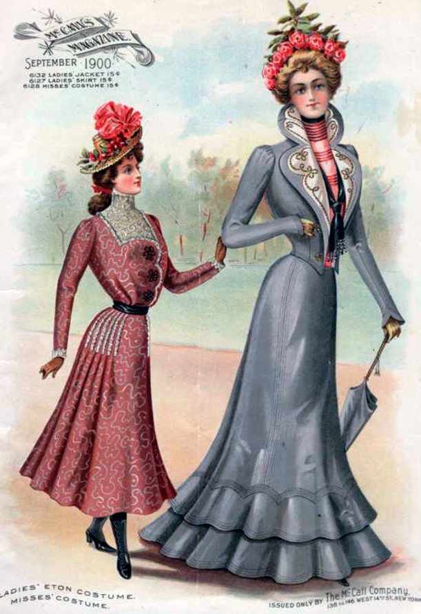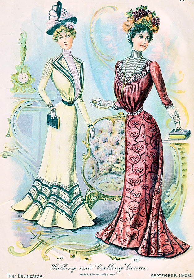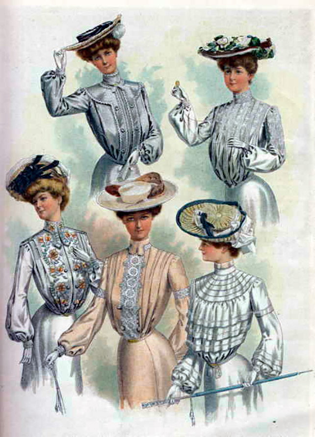En allongeant le torse, il est possible de placer de nombreux éléments aériens sur le corsage : volants luxuriants, draperies de corsage, empiècements en dentelle, volants, volants, etc. La jupe, moulant les hanches, s'éventait le long de l'ourlet. Les cols hauts étaient maintenus en place par des plaques de celluloïd ou réalisés sous la forme de nombreux volants.