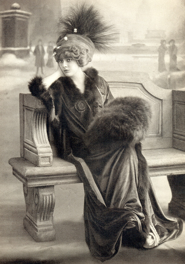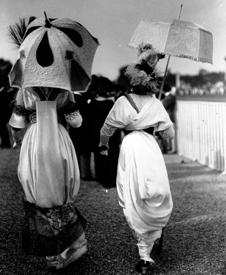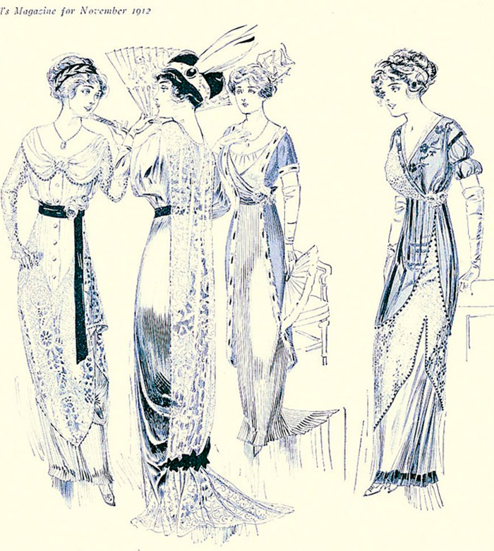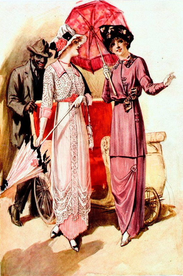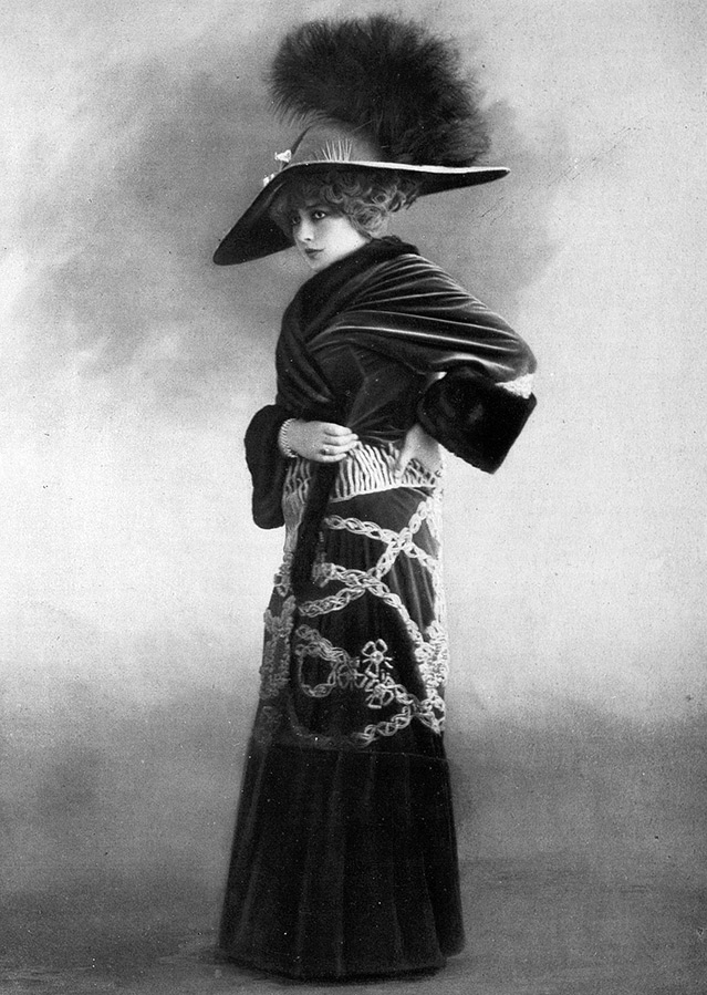 La période 1908 - 1914 peut être caractérisée par la recherche de quelque chose de nouveau, et la mode de l'époque reflétait clairement la situation politique, le développement des mouvements sociaux et la lutte des femmes pour l'égalité. « Le turban descend en oblique jusqu'aux sourcils, une aigrette se balançant, une jupe drapée et des jambes serrées.Sourcils dessinés au crayon, main sur la hanche, ventre en avant - c'est la femme qui s'habille au sultan de la mode et marche à pas de danse vers la catastrophe mondiale.