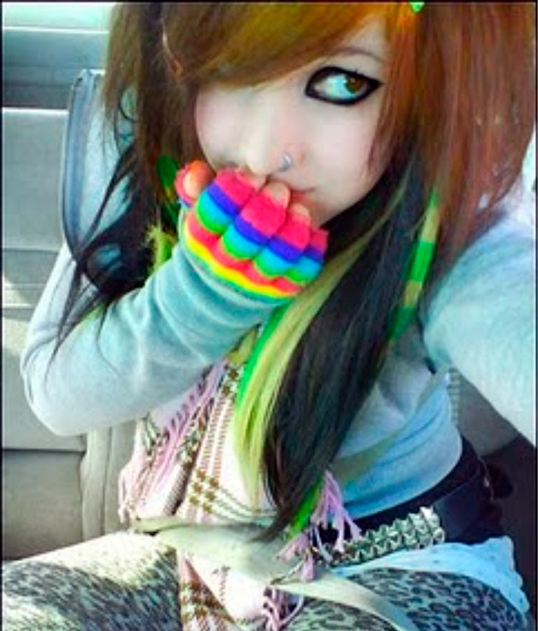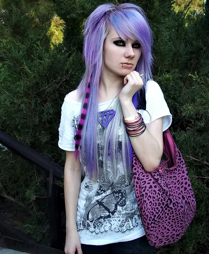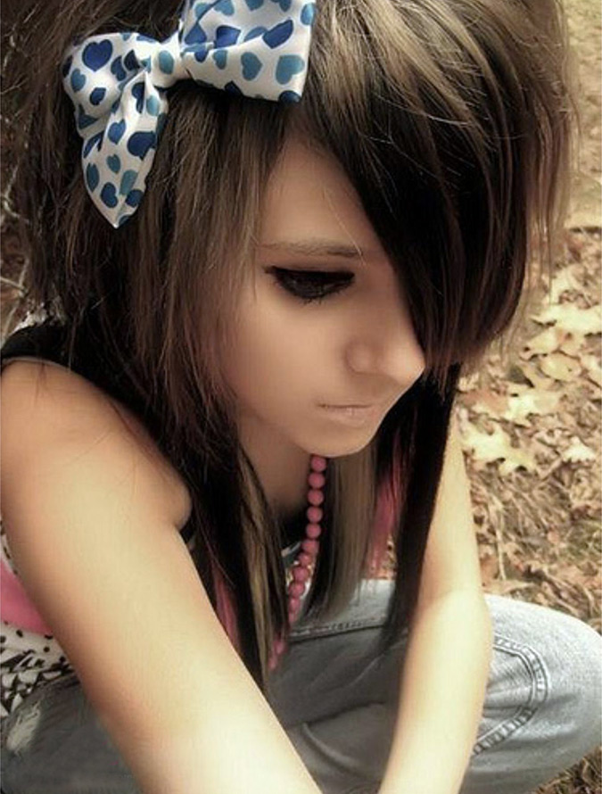 Emo et coiffures faciles à identifier. La coiffure Emo est une frange oblique et déchirée jusqu'au bout du nez, couvrant un œil, et dans le dos, il y a des cheveux courts qui dépassent dans différentes directions. Les cheveux sont meilleurs que les noirs. Les filles peuvent porter des coiffures "enfantines" - par exemple, deux petites queues de cheval avec des épingles à cheveux brillantes sur les côtés, des arcs.