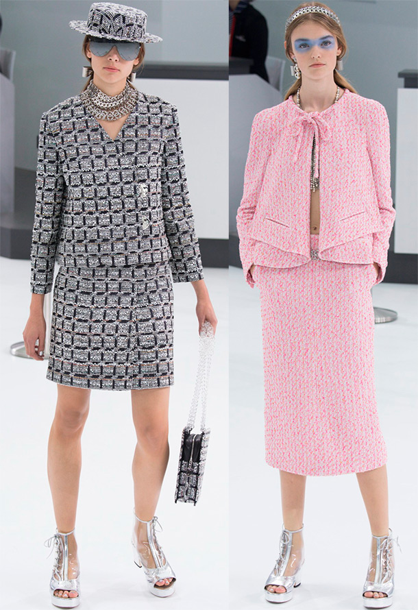 Sa silhouette est inhabituellement laconique - une jupe droite est simple et élégante, une veste courte sans col avec une fermeture droite. Tout est simple et parfait, ce qui rend le style universel et populaire dans le monde entier. Un tel costume peut être acheté ou cousu à partir de n'importe quel tissu, de n'importe quelle couleur.