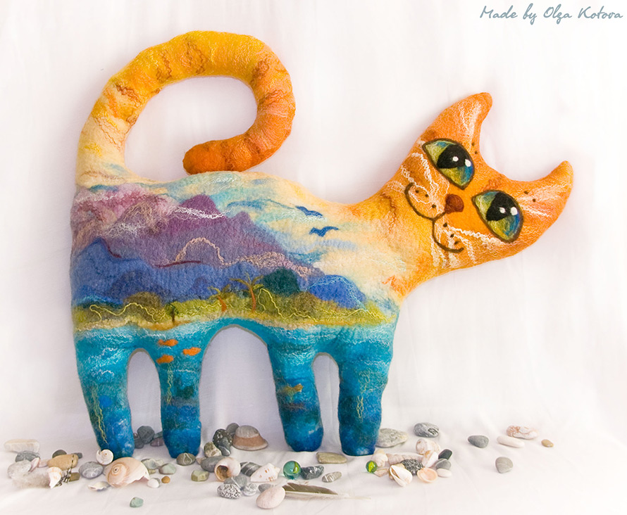 Par exemple, mon "truc" est des oreillers en feutre sous la forme de divers animaux : chats, poissons, hiboux. Le premier chat d'oreiller a été créé en 2010 et est soudainement devenu populaire. Des chats de cette forme (je les ai feutrés sur un motif, donc la forme est facile à répéter) j'en ai créé en cinq ans... je ne sais pas combien, environ 50, j'ai probablement changé la couleur, le motif à chaque fois, différent des paysages, des villes sont apparues sur les chats...