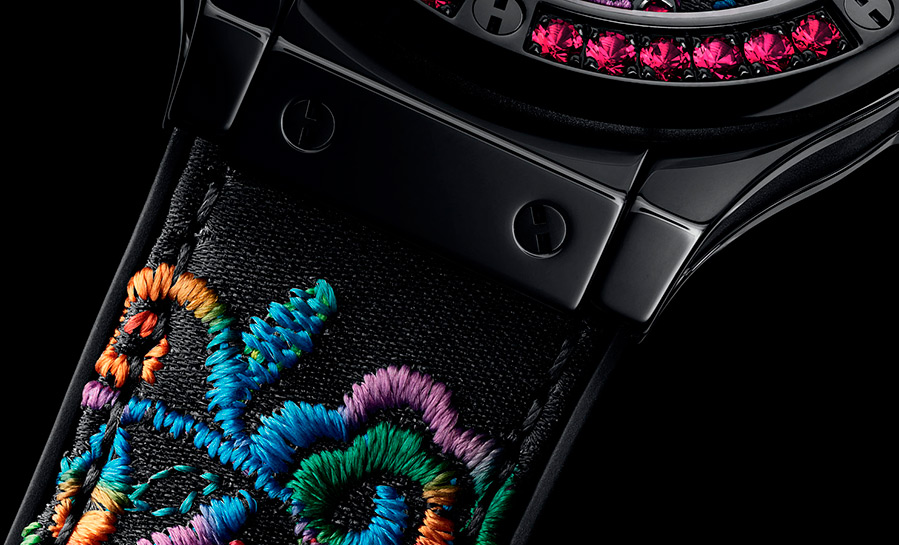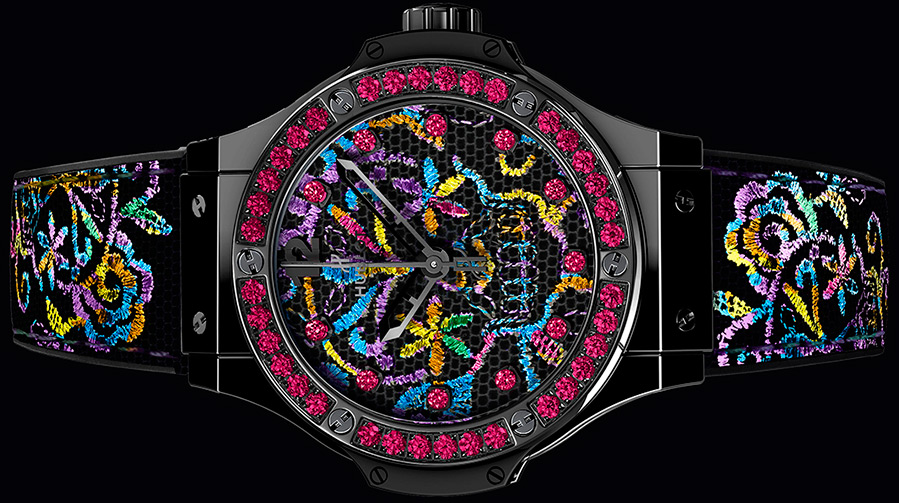 La montre Hublot était décorée de broderies dans le style des ornements mexicains inventés par les tribus indiennes Huichol. Les montres insolites sont présentées en trois couleurs. En plus des ornements indiens brodés, la montre est décorée d'un petit nombre de pierres - spinelles et saphirs. Les trois modèles partagent le même nom Sugar Skull.