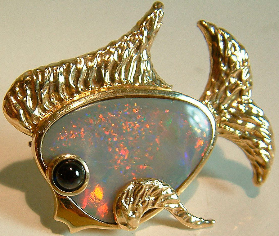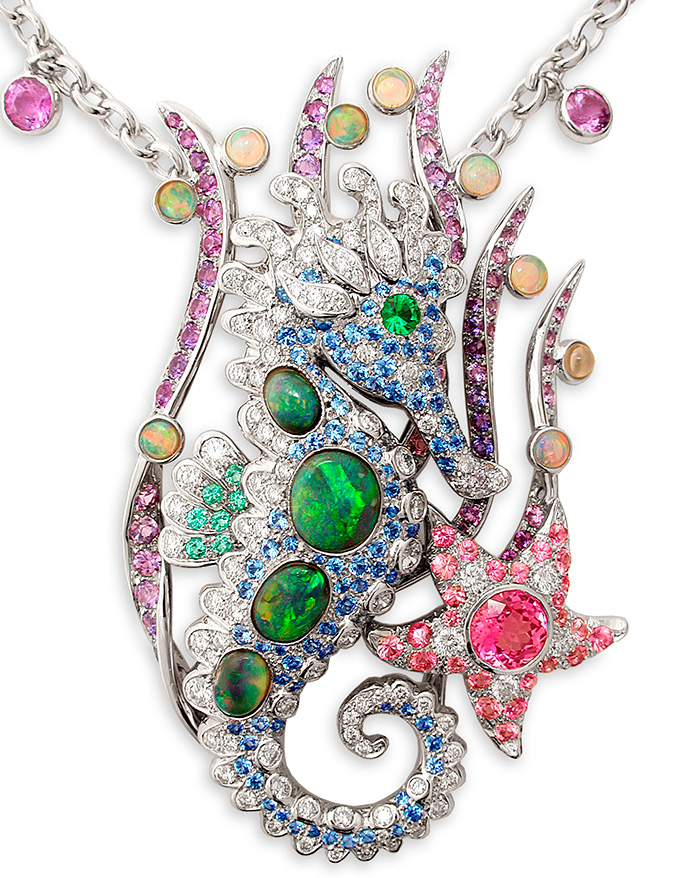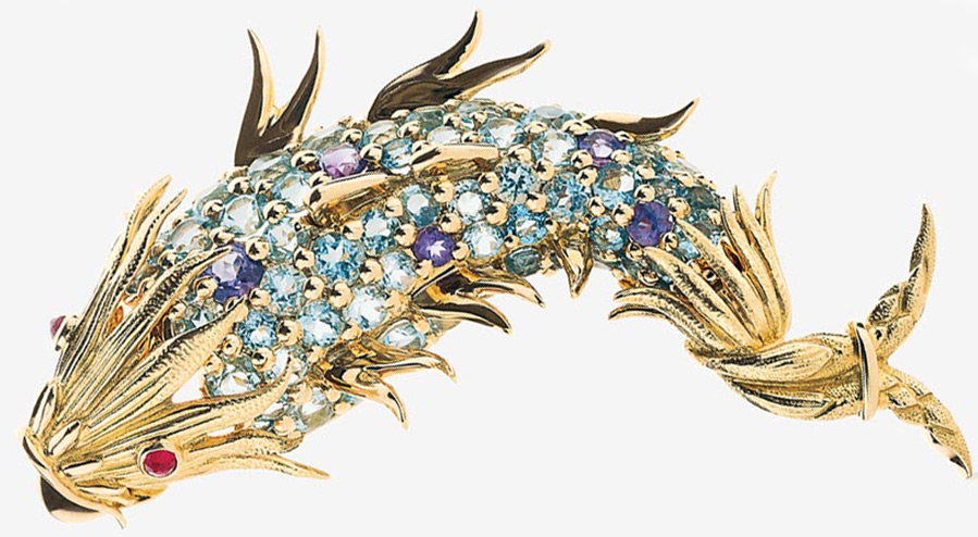 Ses habitants marins bizarres - poissons, coquillages, poulpes suscitent une vive réponse de tous les connaisseurs de beauté. Une broche en forme de poisson, étincelante de ses écailles de métaux précieux et de pierres, une broche - "étoile de mer", un pendentif - "hippocampe", toutes sortes de coquillages, chatoyants de pierres précieuses, et bien d'autres bijoux du fantastique monde des profondeurs marines.