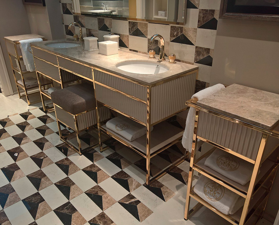 L'architecte d'intérieur Maria Borovskaya, à son tour, note une tendance telle que le métal à l'intérieur. Le laiton et le cuivre dans différentes nuances peuvent déjà être tracés dans tout : appareils de plomberie, raccords, bordures de comptoirs, meubles et panneaux. Les nuances roses de métal semblent particulièrement fraîches dans de telles combinaisons.