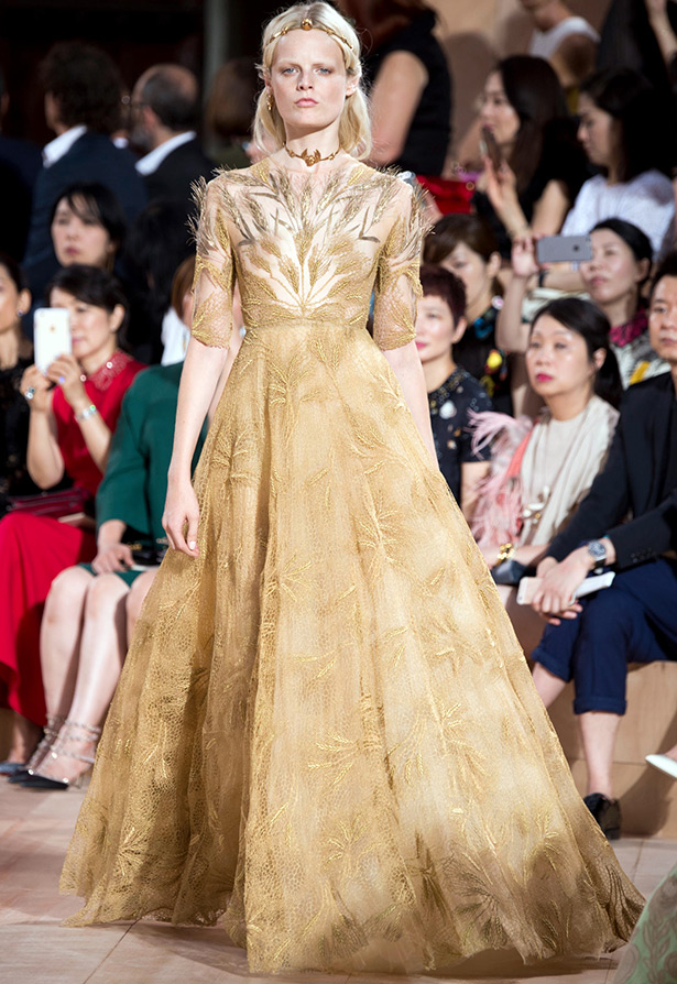 Dans ce cas, vous ne devez pas prendre de modèles avec une traîne, la robe doit presque toucher le sol, mais ne pas gêner les mouvements. Peut-être qu'il sera asymétrique et que devant vous ouvrira vos jambes élancées. L'essentiel est que la robe ait l'air chère, ce qui signifie que le tissu coûteux et la décoration traditionnelle sous forme de broderie, de dentelle, de perles, de broderie dorée sont importants ...