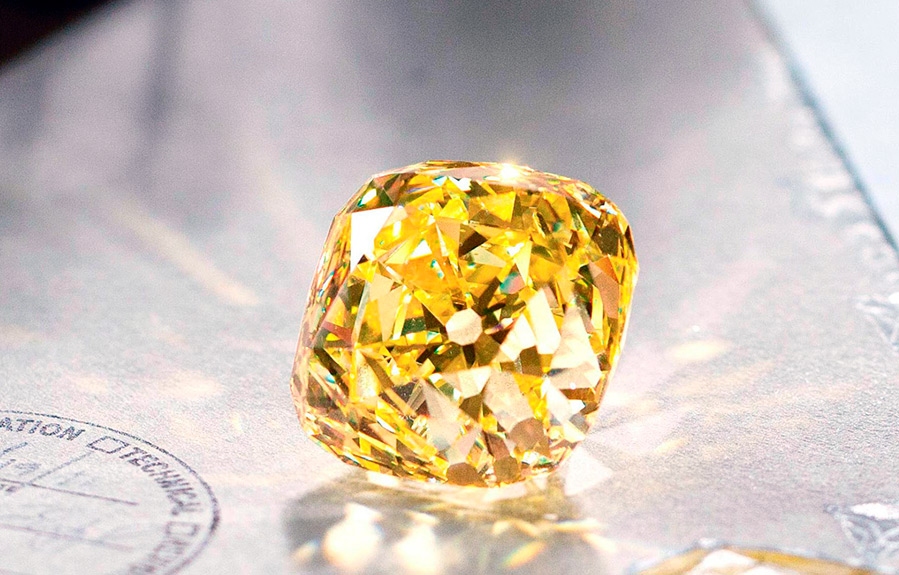 Le diamant soleil miel est l'un des diamants les plus célèbres et les plus reconnaissables au monde. Il se reconnaît à sa coupe originale et à un petit oiseau doré avec une touffe, comme s'il grimpait sur un rocher doré. Schlumberger a réussi à incarner le miracle de la nature dans une œuvre d'art unique.Le beau diamant est depuis longtemps devenu la marque de fabrique de la maison de joaillerie Tiffany & Co et porte son nom - le diamant Tiffany.