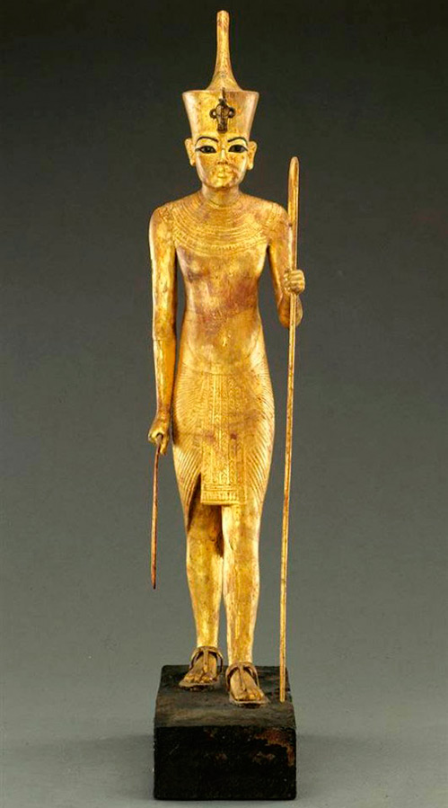 Une figurine du pharaon Toutankhamon dans une haute coiffe de Haute Egypte, sur la figurine on peut voir le shenti et uckh