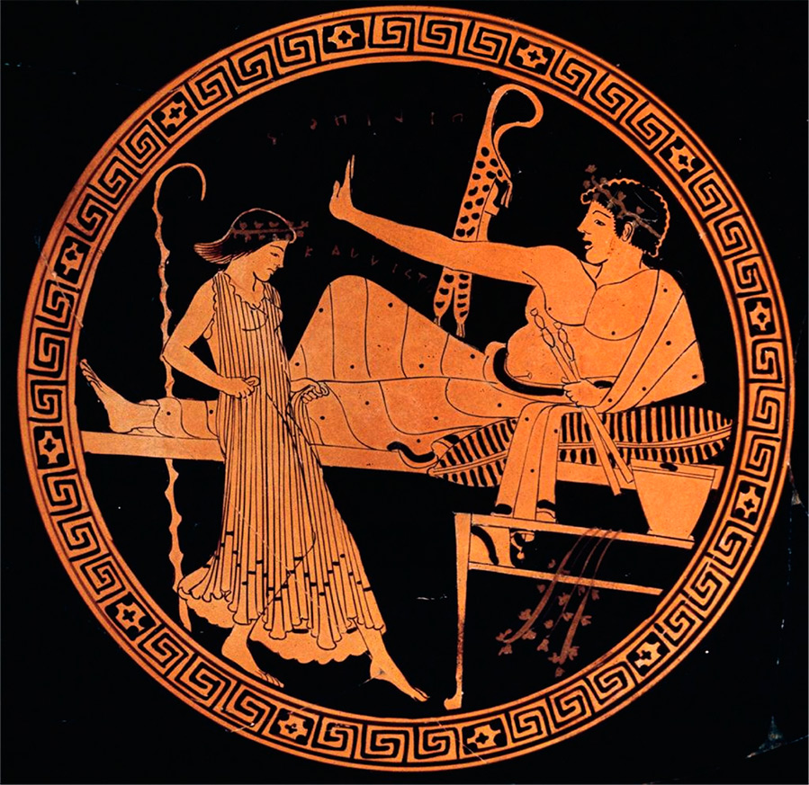 Kilik à figures rouges représentant un symposium Grèce antique. 490-480 avant JC NS.