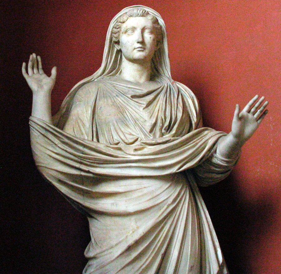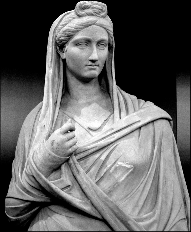 Le manteau porté par les Romains s'appelait la palla... Palla était similaire à l'himation grec, drapé de diverses manières, avec un chevauchement à la taille, et recouvrait parfois la tête avec le bord supérieur. D'ailleurs, contrairement aux femmes grecques, les femmes romaines dans les rues des villes pourraient bien sortir avec tête nue... La cape palla était attachée sur les épaules avec des fermoirs appelés agraphes.