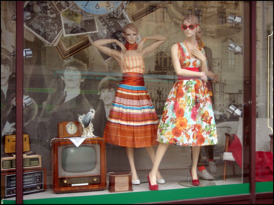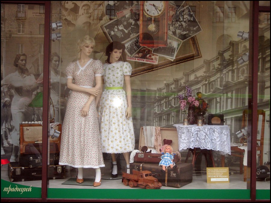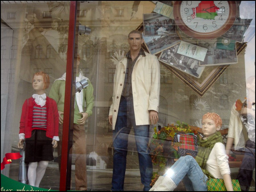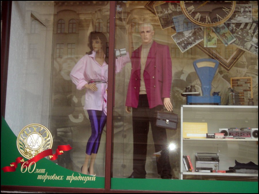 Mais en l'honneur de son soixantième anniversaire, GUM a néanmoins fait plaisir aux citoyens de Minsk. Des mannequins sont apparus sur les vitrines de GUM, démontrant clairement l'évolution de la mode, des années 50 aux années 2000. En longeant l'avenue le long des vitrines GUM, on peut voir des robes fleuries des années 50, des robes lumineuses et chaudes des années 60, le style des "Bremen Town Musicians" des années 70 (oh, ces chapeaux à large bord !), Pionniers des années 80, les fameux leggings et vestes pourpres des années 90, et des années 2000 - pantalons, pulls, jeans... Ces vitrines amusent les passants, les passants s'arrêtent et examinent. Il est également réjouissant que dans ces vitrines non seulement les tenues, mais aussi l'entourage soient sélectionnés : les années 90, les années 90 sont des gammes, des partitions, des magnétophones, les années 80 sont le programme "Time", les années 70 sont des guitares, un magnétophone radio, 60 -s - les premiers téléviseurs, photographies des Beatles, les années 50 - la poitrine de grand-mère, une table ronde avec une nappe, une poupée. Ces vitrines sont intéressantes à voir ! La machine à remonter le temps fonctionne, et là, dans les vitres, chacun peut voir l'époque de sa jeunesse.