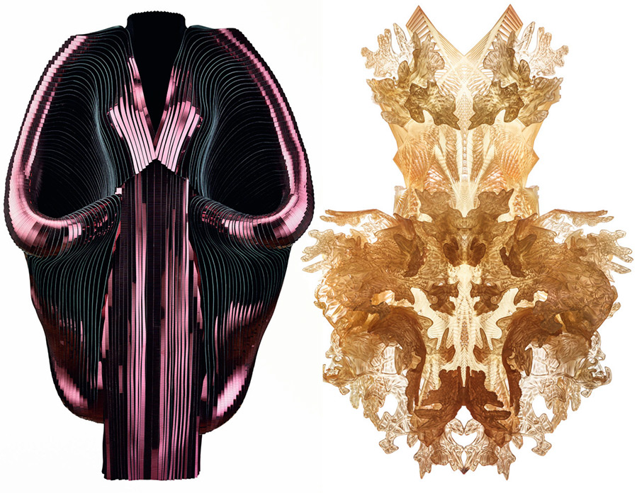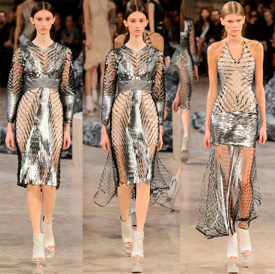 Certaines robes d'Iris van Herpen semblent imiter l'effet des ondes électromagnétiques sur une personne en utilisant les techniques de couture les plus sophistiquées, tandis que d'autres font du modèle une reine méduse. Iris van Herpen recouvre les brins de cuir d'une feuille de métal, et leurs objets se transforment en objets chatoyants d'un autre monde. Elle utilise également des logiciels de modélisation 3D et des imprimantes 3D pour créer des robes et autres tenues.