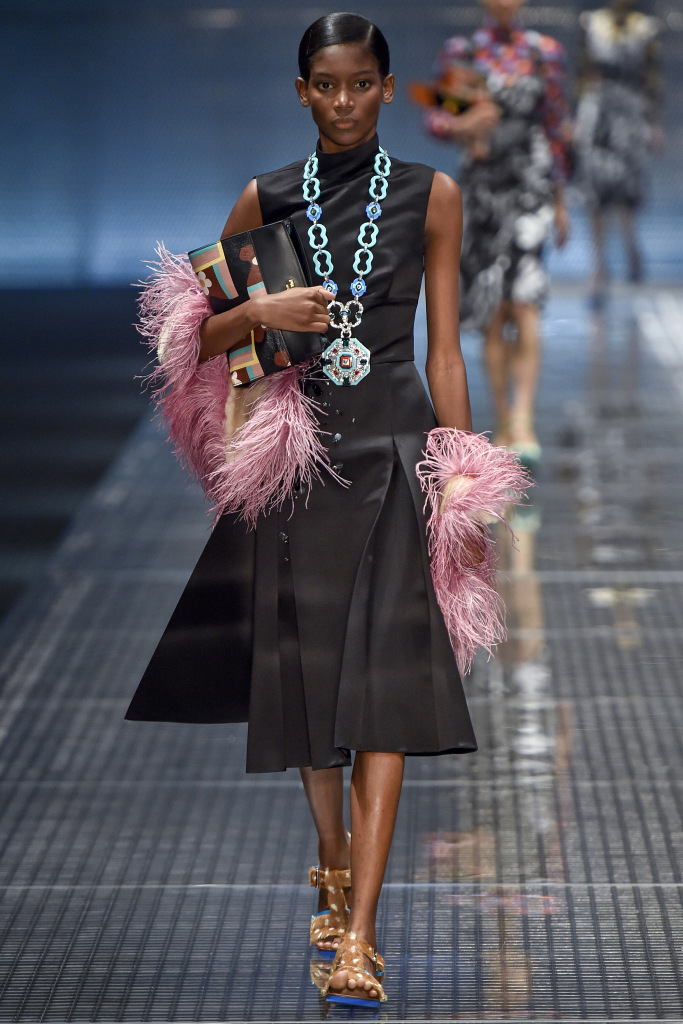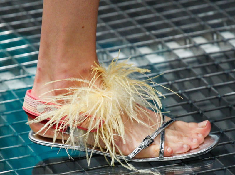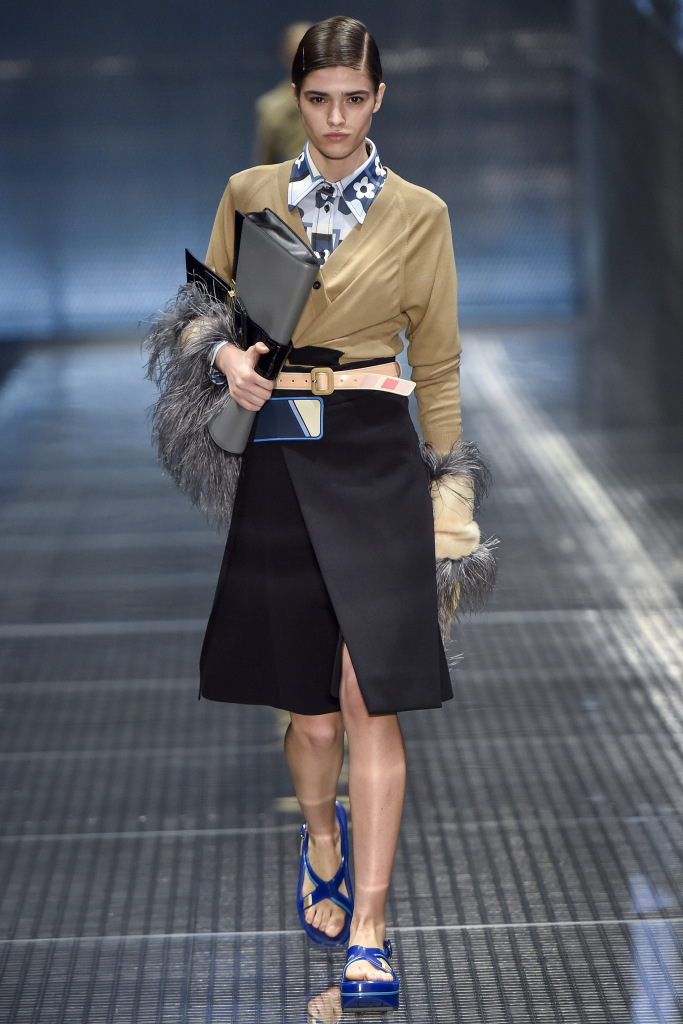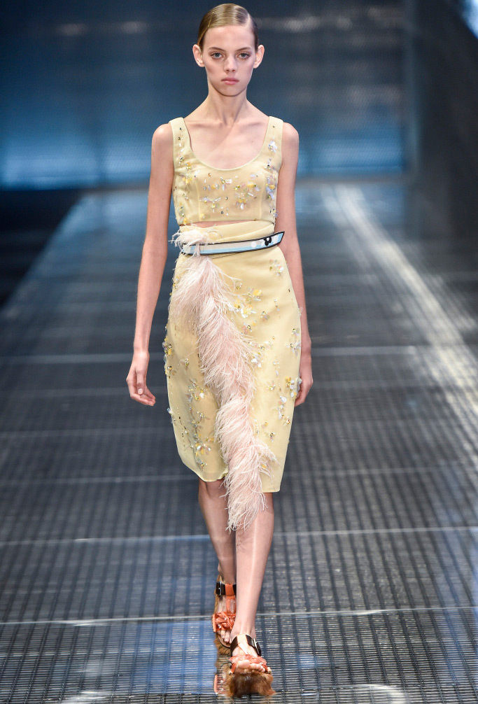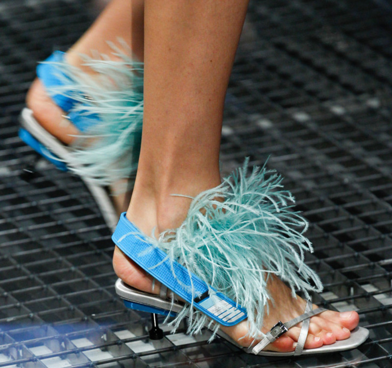 Dans la collection printemps-été 2026 de Prada, le décor le plus marquant est celui des plumes de marabout. Accessoires, manchettes, jupes et même sandales sont ornés de plumes. En second lieu, vous pouvez mettre de l'asymétrie, dans la collection il y a beaucoup de jupes portefeuille asymétriques originales qui sont combinées avec des cols roulés en maille fine, des chemises et des pulls.